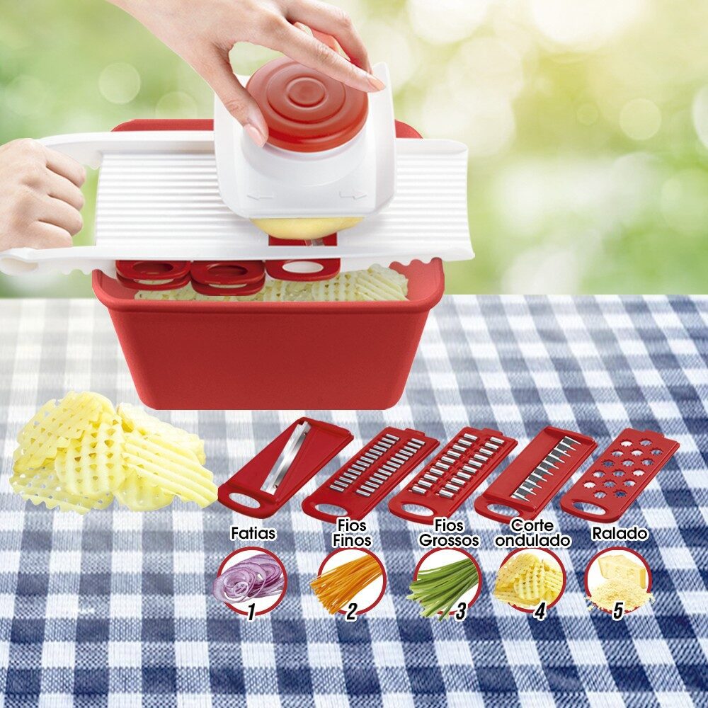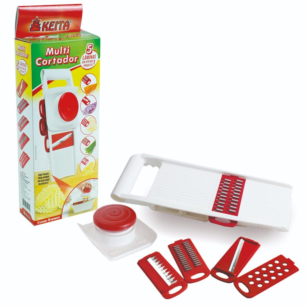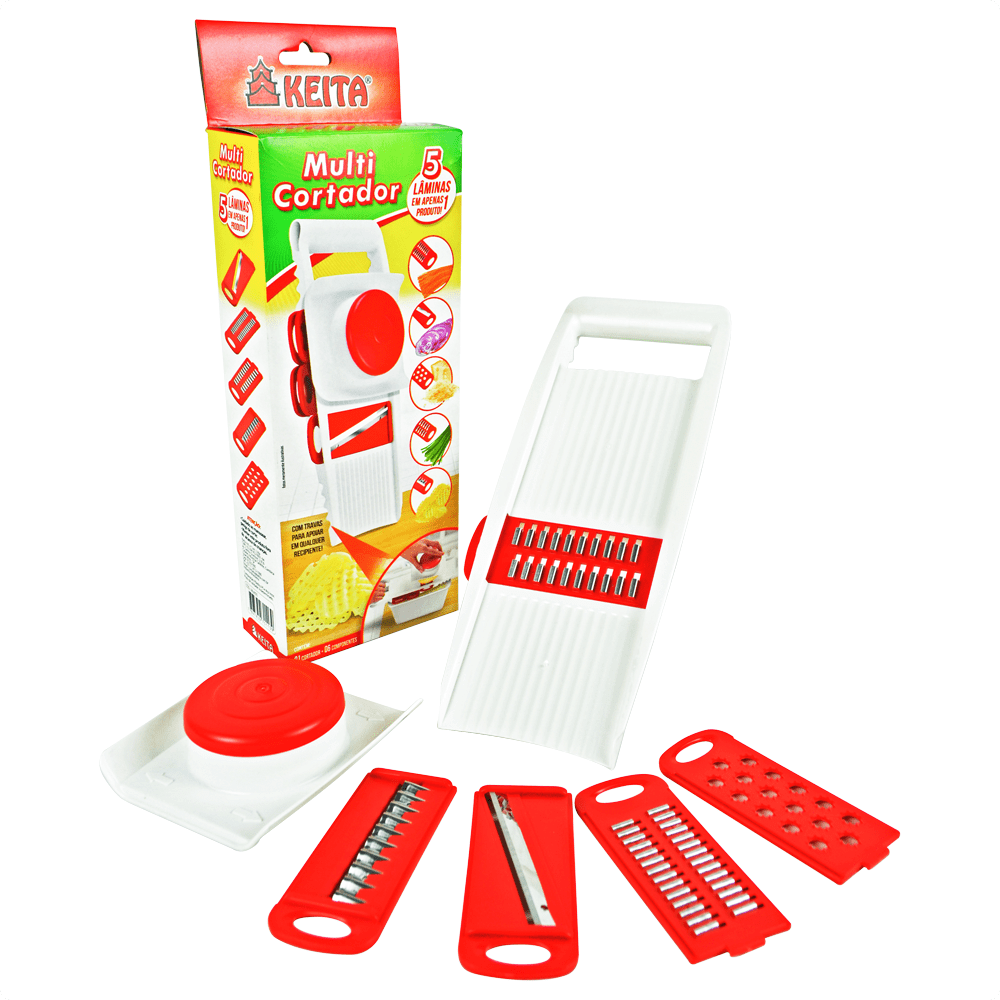 Produto: Fatiador Marca: Keita Material: Plástico Metal Cor: Branco, vermelho Características: Fatia Rala Desfia Quantidade de peças: 7 Itens Inclusos: 1 fatiador 5 lâminas 1 protetor para mãos Dimensões do produto (A): Fatiador 28cm Lâmina: 10,7cm