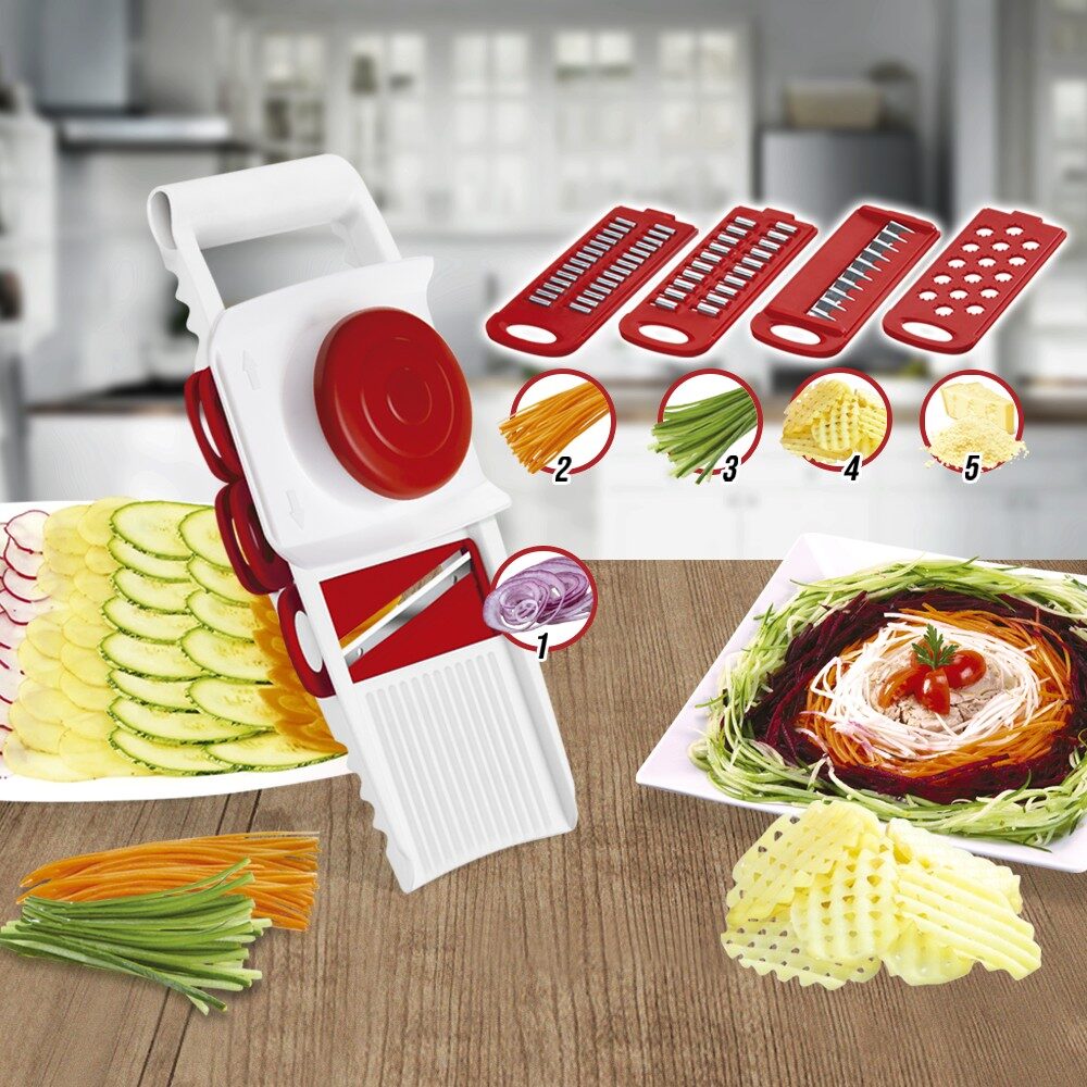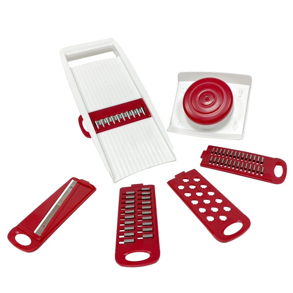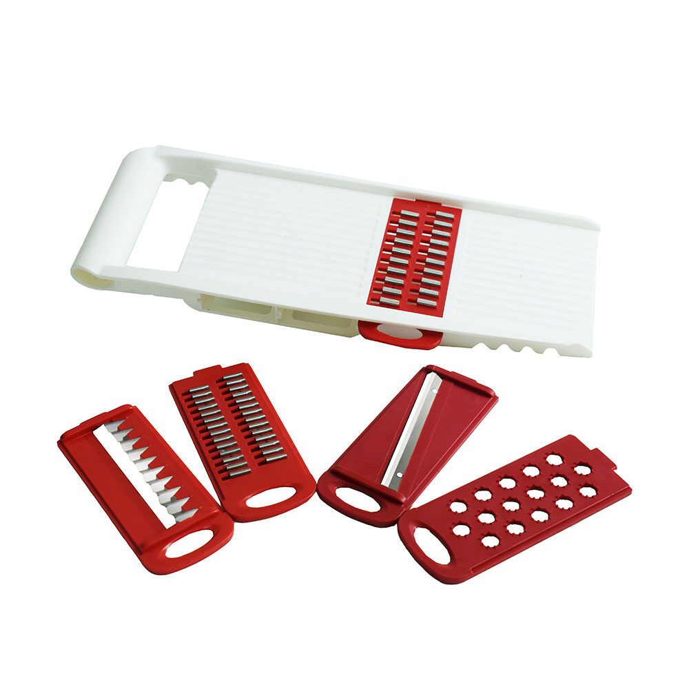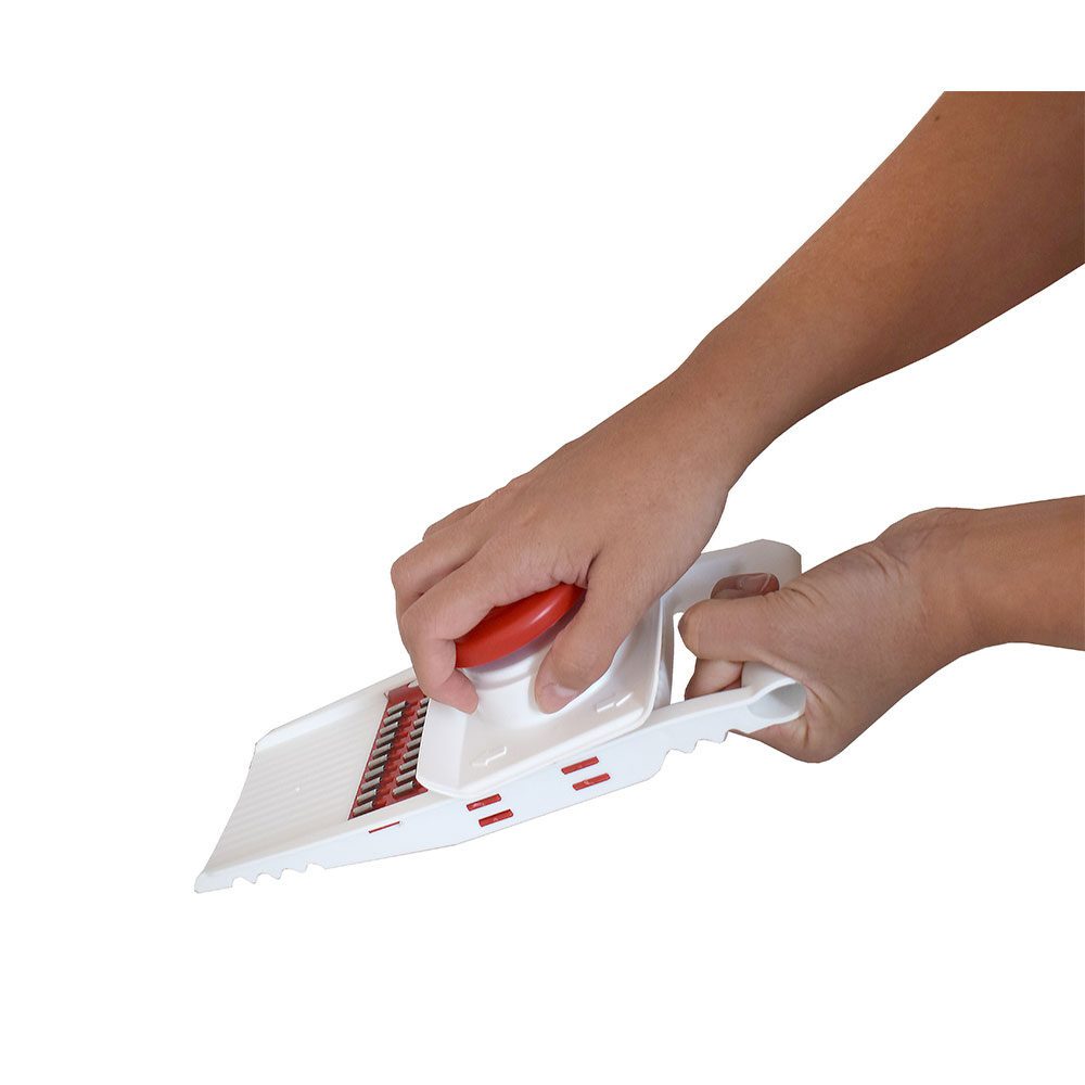 Produto: Fatiador Marca: Keita Material: Plástico Metal Cor: Branco, vermelho Características: Fatia Rala Desfia Quantidade de peças: 7 Itens Inclusos: 1 fatiador 5 lâminas 1 protetor para mãos Dimensões do produto (A): Fatiador 28cm Lâmina: 10,7cm