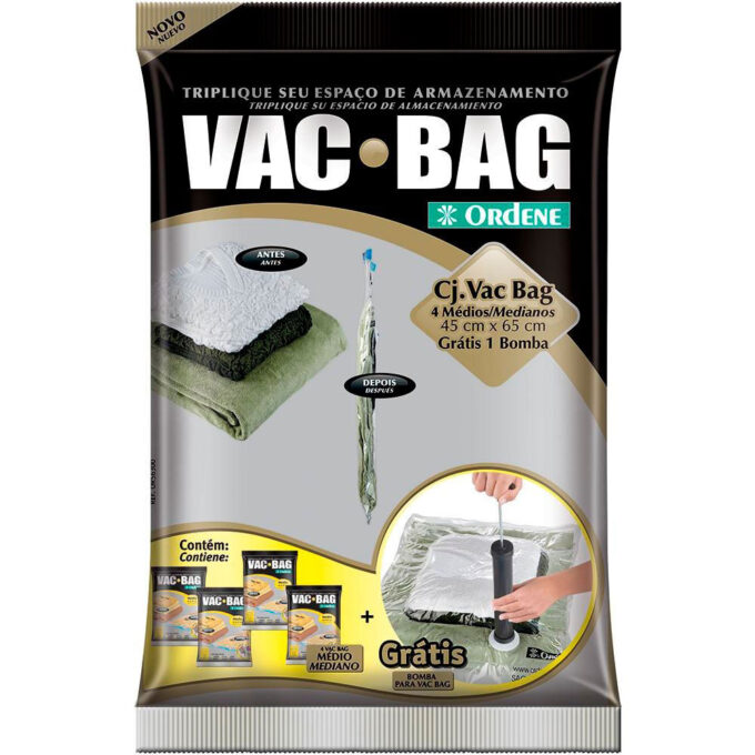 Itens inclusos: 4 sacos organizadores à vácuo médio e 1 bomba de vácuo