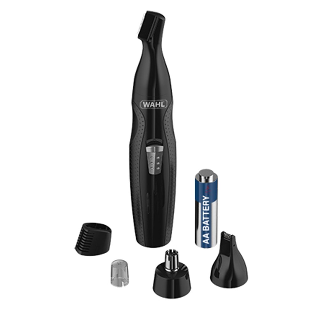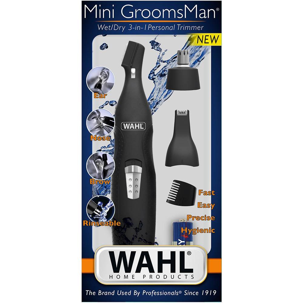 O Trimmer Mini GroomsMan da Wahl é um eficiente Aparador de Pêlos que corta suavemente os pelos do nariz e da orelha. Construído com materiais super resistentes, ele comporta três lâminas rotativas de corte preciso e não enferrujam. Vem acompanhado de acessórios como pente e ajuste de altura. É eficaz e perfeito para levar para qualquer lugar na mochila ou necessaire. Funciona com uma pilha AA, já inclusa na embalagem. Tem corpo com acabamento em preto.