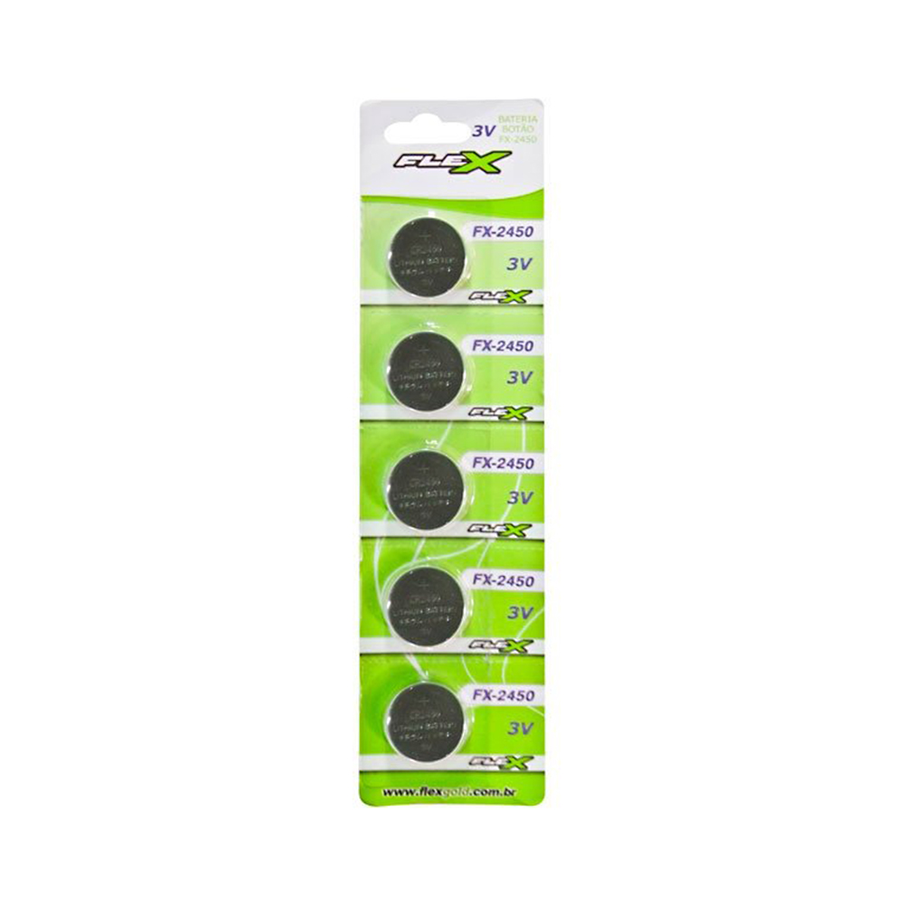 A bateria botão de lithium FX2450 Flex de 3v pode ser usada em calculadoras, placas mãe de computadores, controles remotos, chaves de carros e outros. A cartela contém 1 unidade de bateria tipo botão com 300mAh cada para que seus aparelhos continuem funcionamento perfeitamente.