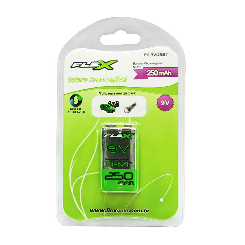 A bateria recarregável Flex de 280mAh e 9v é ideal para controles remotos, lanternas, alarmes e brinquedos. Possui monitoramento de voltagem que controla o modo de carga ideal para cada item. Conta ainda com proteção curto-circuito e dasligamento automático.