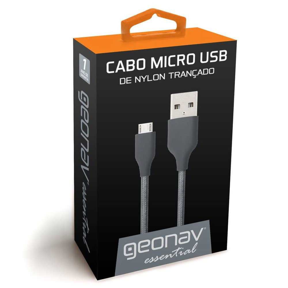 O Cabo Geonav possui conexões de um lado usb 2.0 macho e o outro micro usb macho. É aplicável a todos os dispositivos portáteis com as interfaces micro usb e usb, tais como: smartphones, tablets, câmeras fotográficas, aparelhos de som, gps, entre outros. O cabo tem 1m de comprimento e acabamento em nylon trançado ultra resistente na cor cinza, além de pontas metalizadas que o torna ainda mais resistente.
