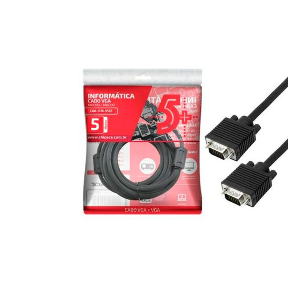 O Cabo VGA Macho x Macho ChipSCE é utilizado para transmitir imagens em equipamentos com saída de 15 pinos para monitores ou televisores com entrada de 15 pinos. Seu cabo tem 5 metros de comprimento e possui trava de conexão com filtro ferrite que é a melhor solução para transmissão de sinal analógico. Transmite apenas imagem, utilizar outro cabo para transmissão de som.