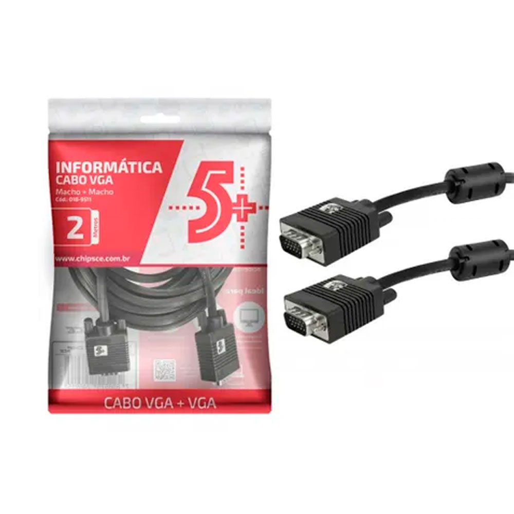 O Cabo VGA Macho x Macho com Filtro da 5+ é utilizado para transmitir imagens em equipamentos com saída de 15 pinos para monitores ou televisores com entrada de 15 pinos. Seu cabo tem 2 metros de comprimento e possui trava de conexão com filtro de ferrite que é a melhor solução para transmissão de sinal analógico. Transmite apenas imagem, utilizar outro cabo para transmissão de som.