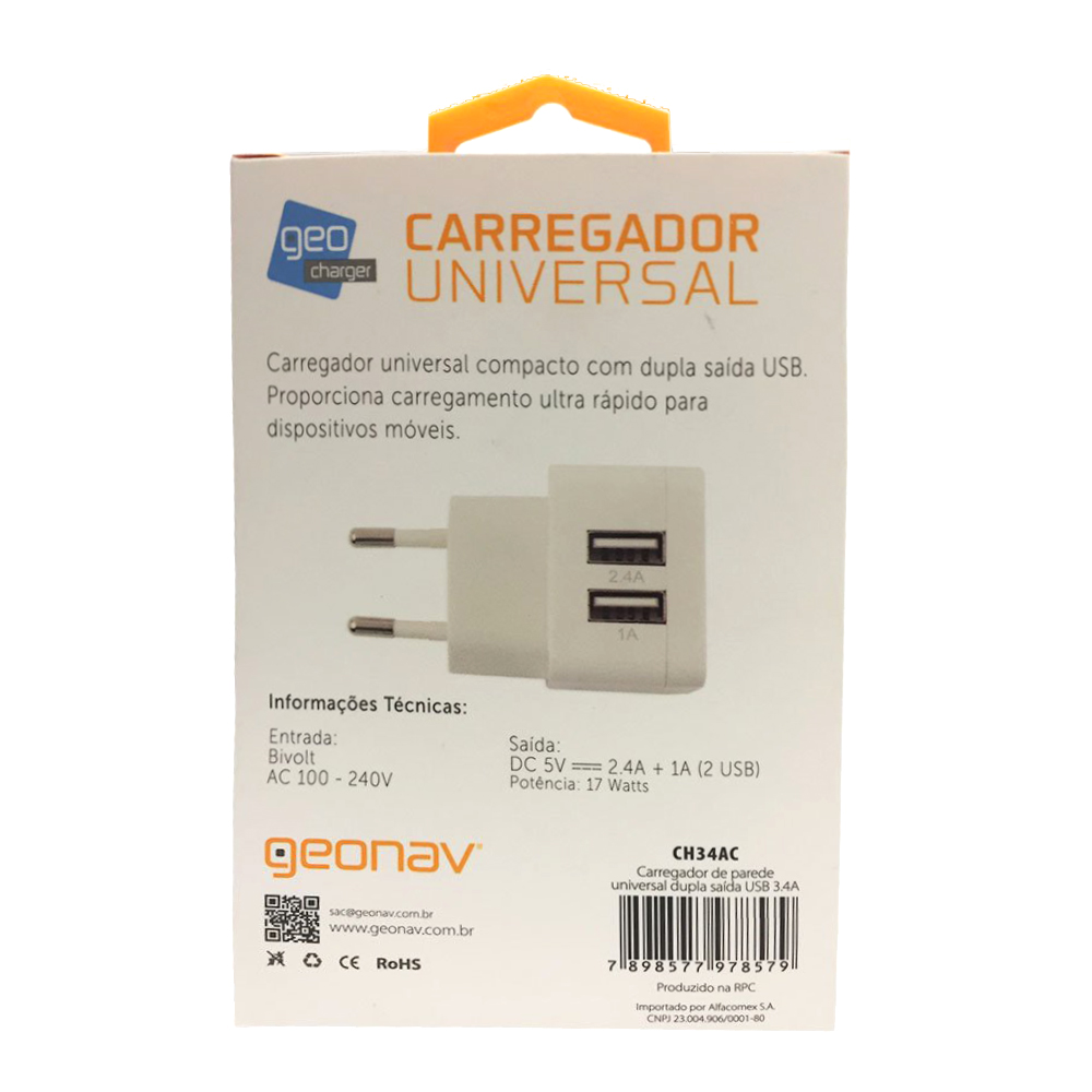Carregador de Parede Universal CH34AC com 2 USB Geonav SKU: 2028902