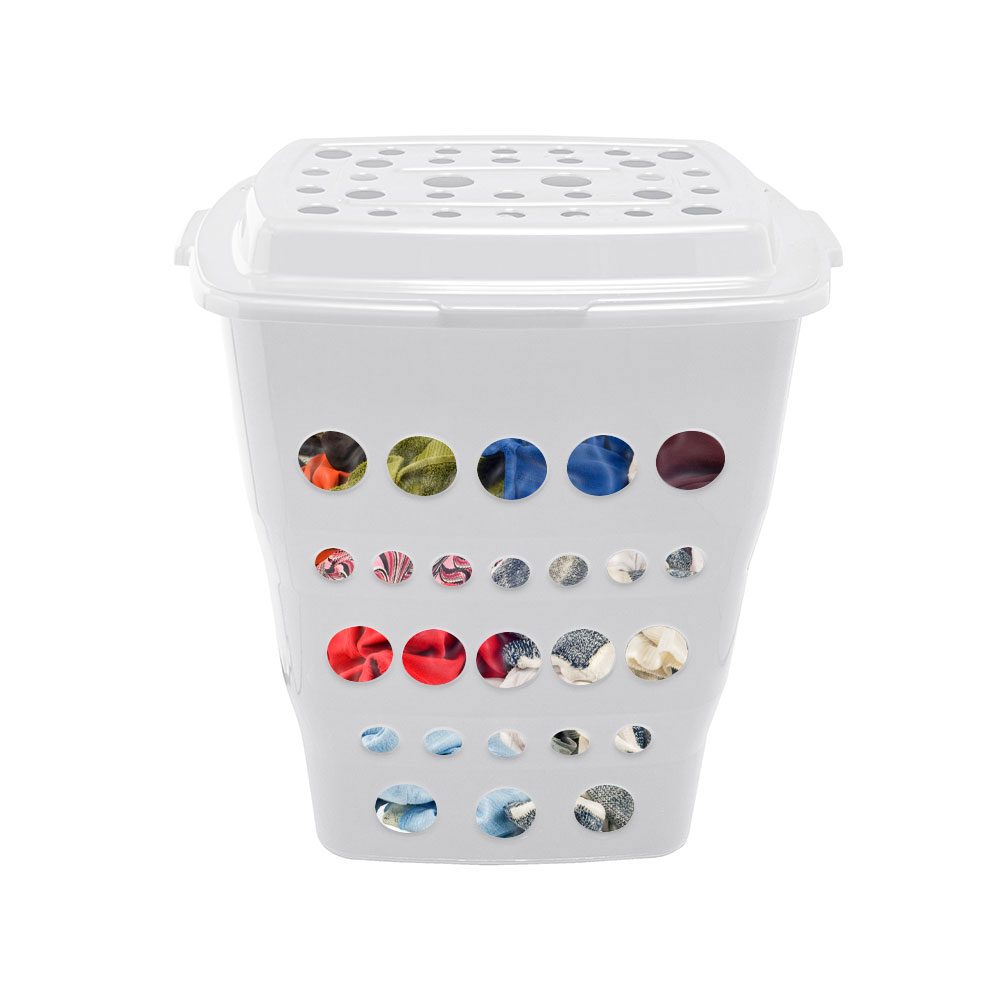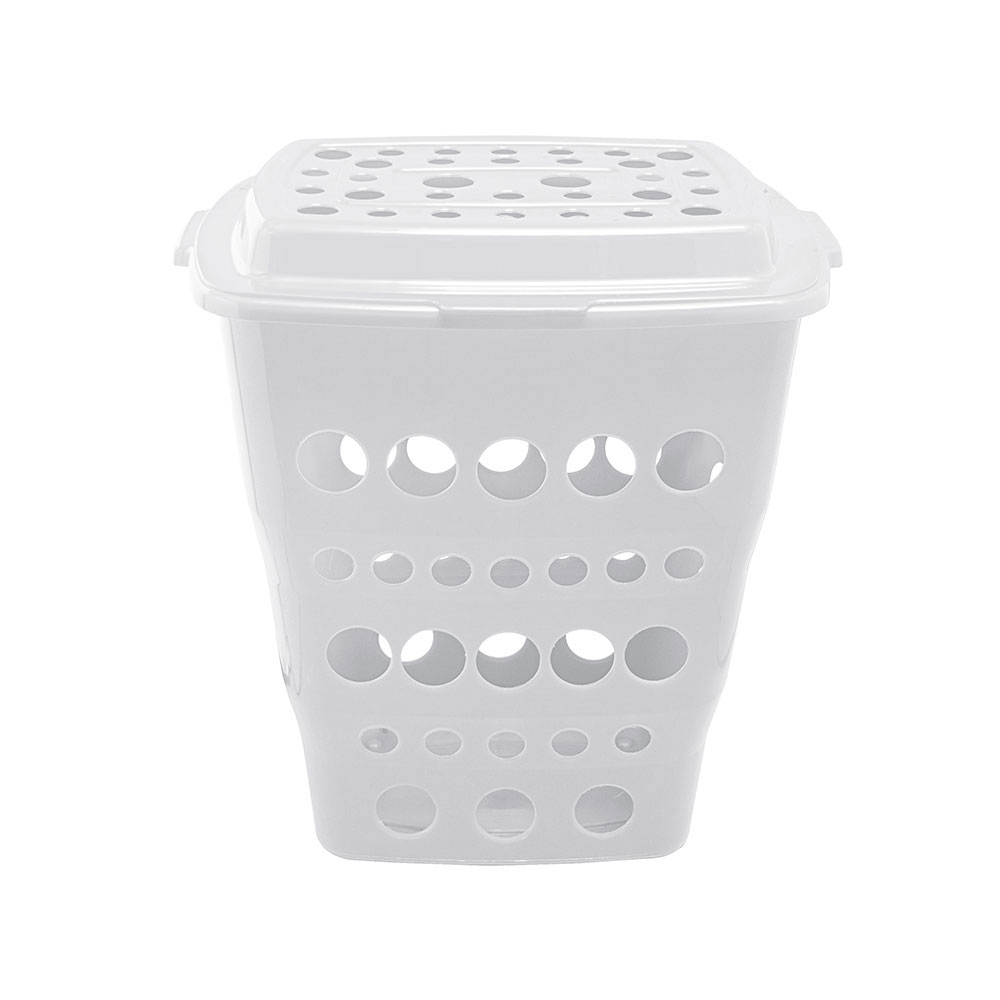 Cesto de Roupas com Tampa em Plástico Branco Paramount com capacidade para até 55 litros. Com 57 cm de altura, é feito de material resistente e possui furos que permitem que as peças estejam sempre arejadas. Seu tamanho é ideal para transportar roupas pessoais, de cama, mesa ou banho sem dificuldades e acabar com o problema das peças espalhadas pela casa ou pelos cômodos. Deixe- o no banheiro ou lavanderia.