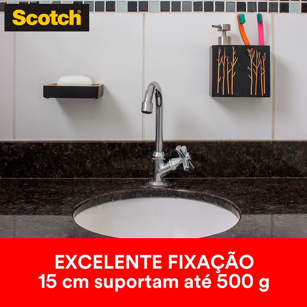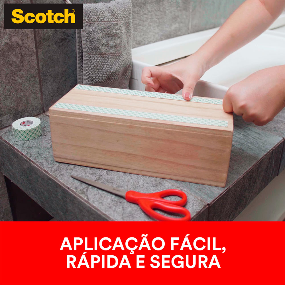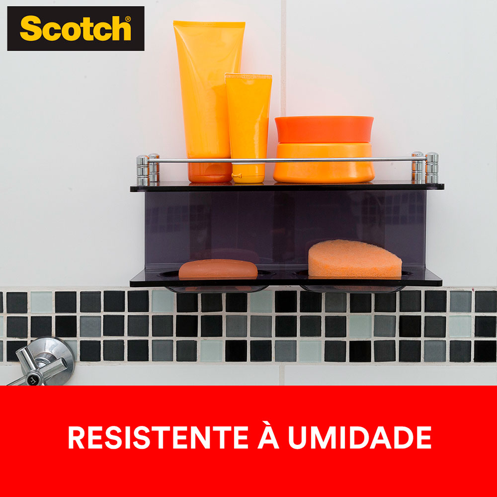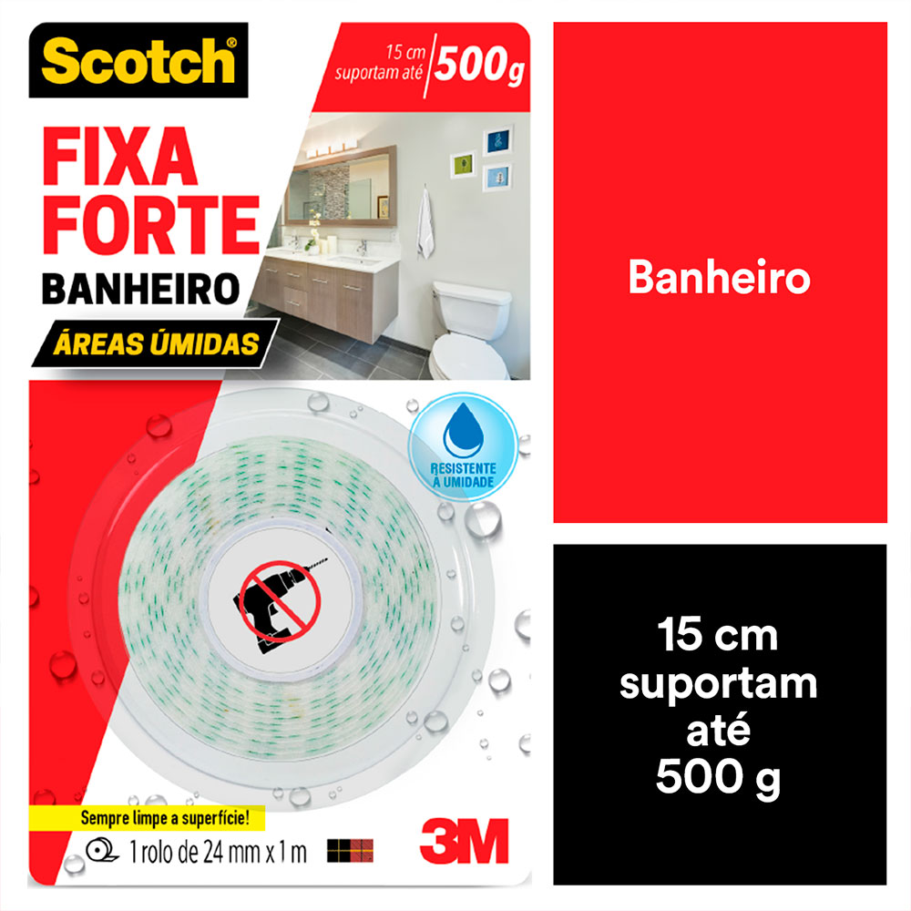 Fita Fixa Forte Dupla Face para Banheiro Scotch 3M, é a única indicada para fixar de forma permanente espelhos, quadros, objetos decorativos e acessórios em banheiros, devido a umidade do ambiente. Sua aplicação é fácil e segura, evitando a perfuração de superfícies e canos. Proporciona também fixação permanente de qualidade profissional em ambientes úmidos, sua aplicação limpa e sem barulho dispensa o uso de pregos e parafusos, prevenindo dores de cabeça com canos furados e revestimentos quebrados.