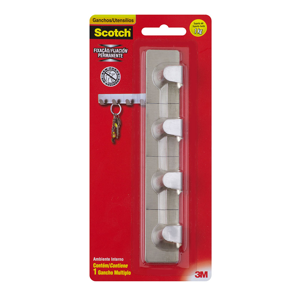 Chega de furar as paredes, portas e armários para pendurar suas bolsas, chapéus e acessórios. O gancho adesivo de metal Scotch 3M é feito de aço inox, suporta até 1kg e possui adesivo à base de borracha sintética e liner protetor. Esta embalagem possui 1 unidade do gancho adesivo. Pendure o que você quiser com praticidade e sem furos.
