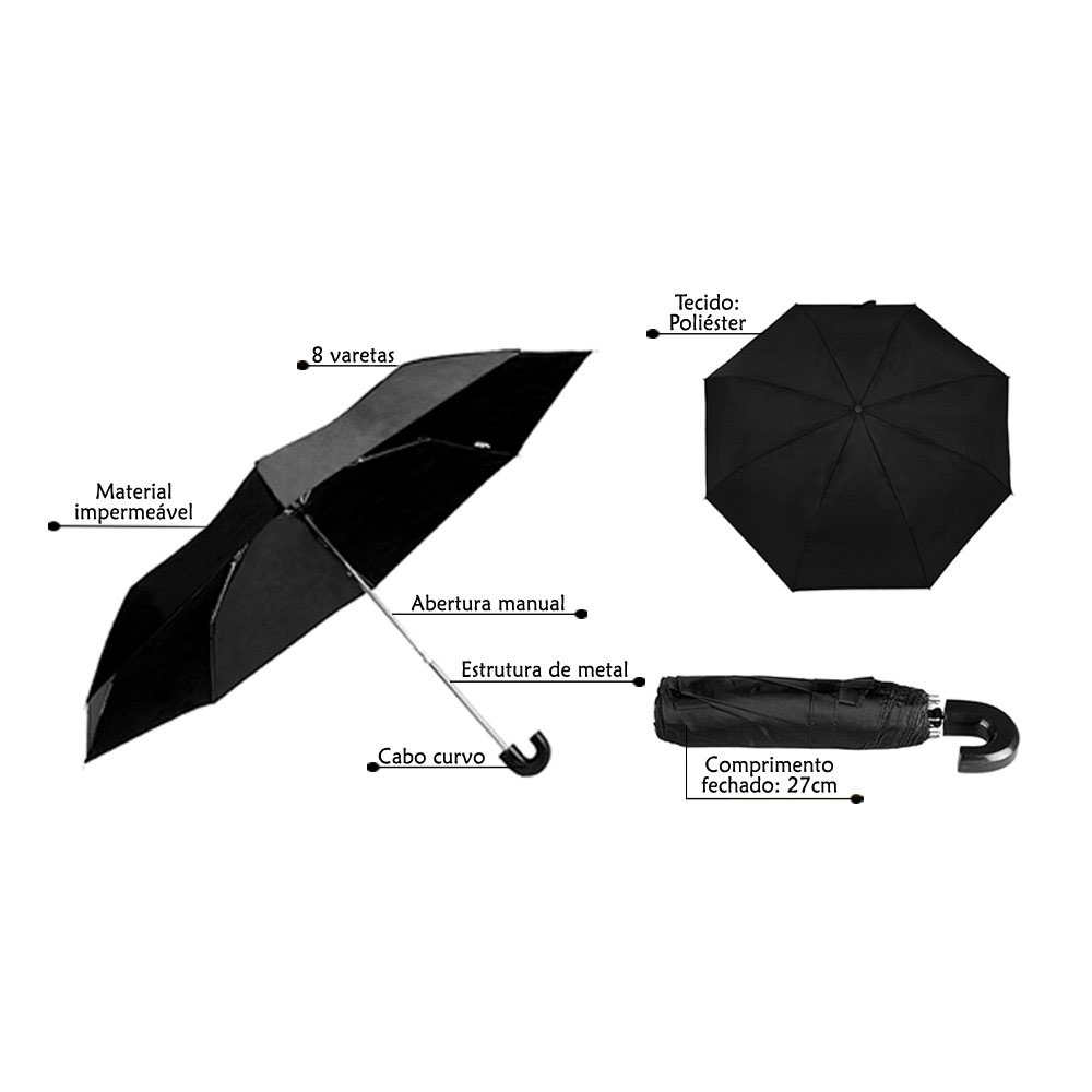 Com o Guarda Chuva Manual Brizi você tem o melhor custo benefício para se proteger da chuva. Produzido em metal e poliéster impermeável na cor preta, possui 3 seções e 8 varetas, com abertura manual. Seu cabo é curvo e seu tamanho é ideal para levar em bolsas e mochilas.
