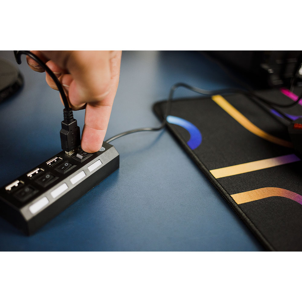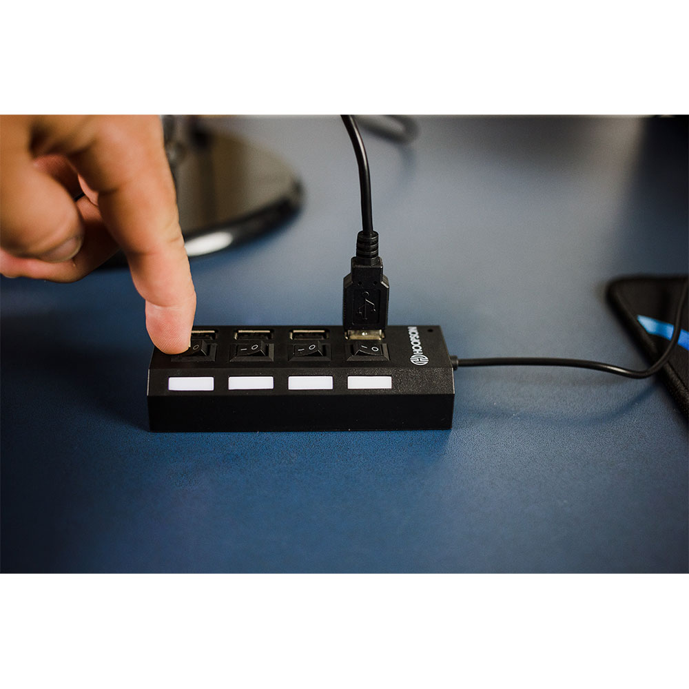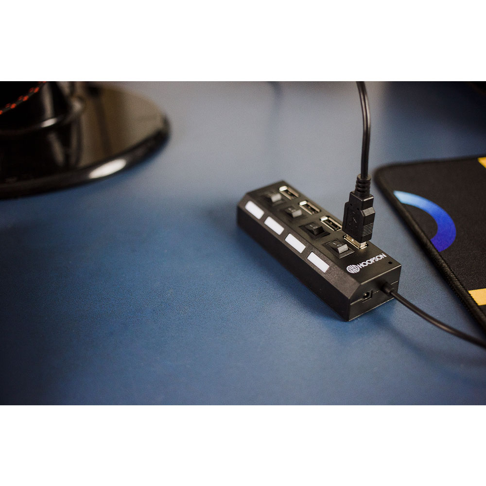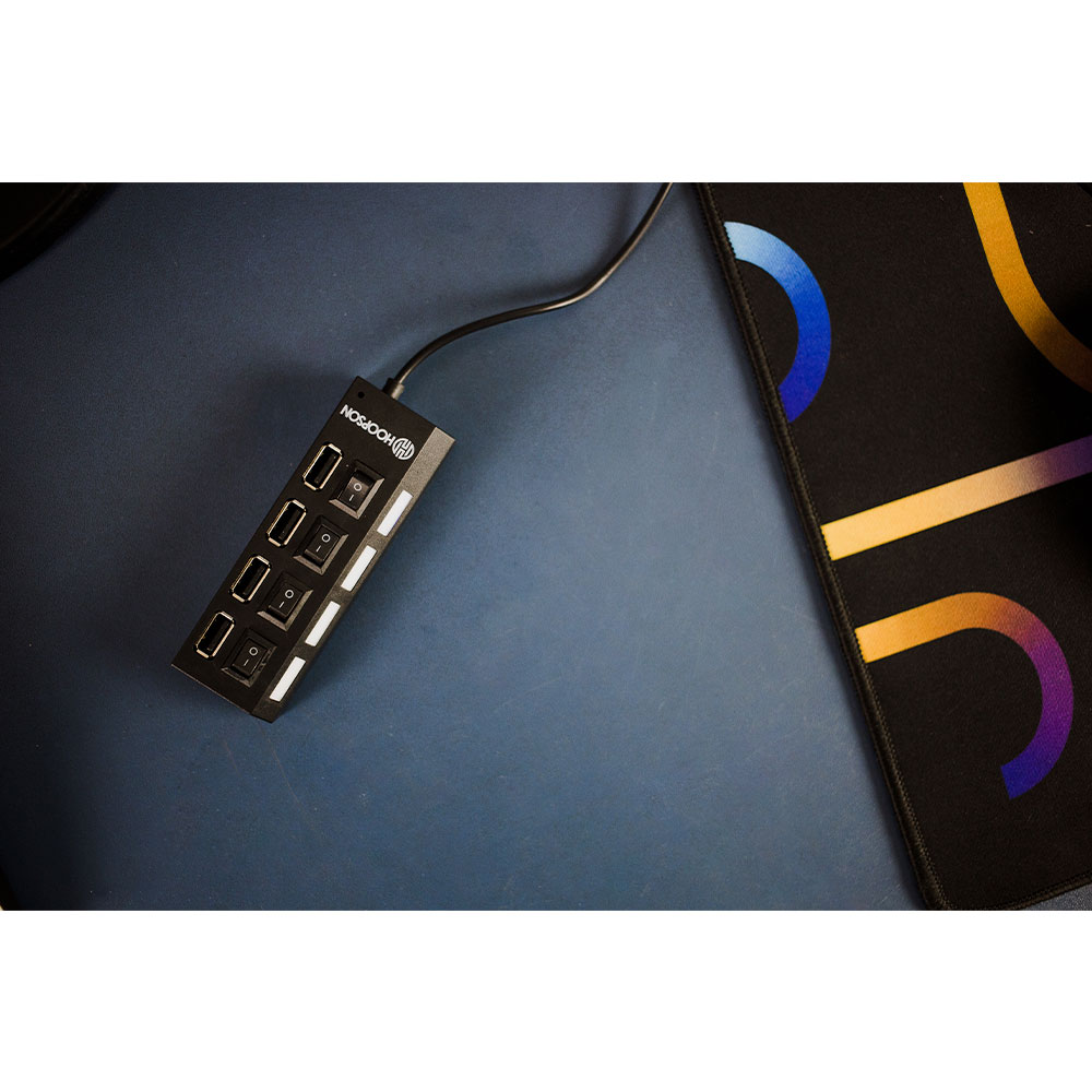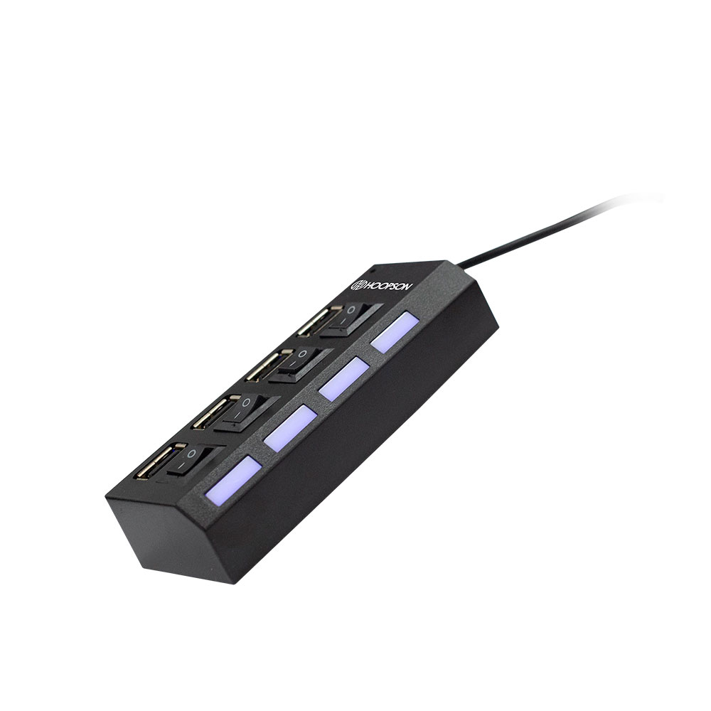 O Hub da Hoopson possui 4 portas USB 2.0 de alta velocidade. Vem com botões: chave seletora por porta e led indicador. Com tecnologia plug and play, transfere até 480 Mbps.