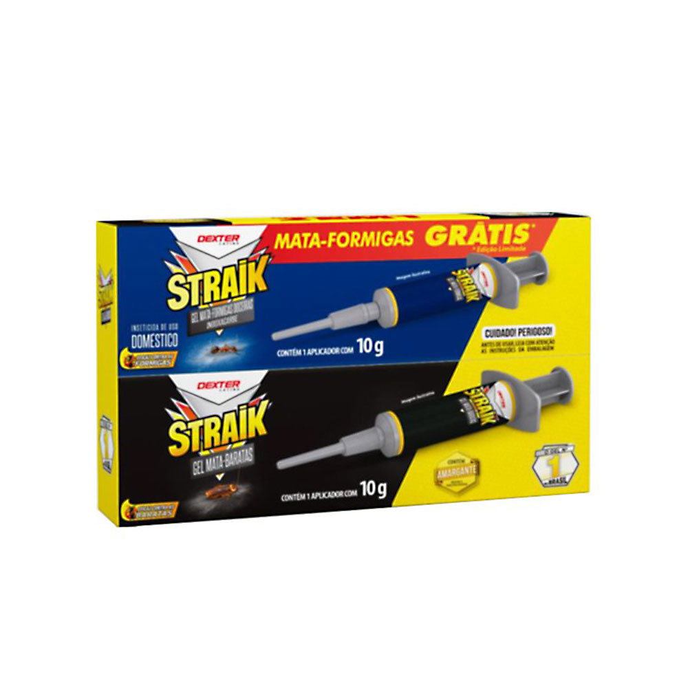 O Kit Inseticida em Gel Straik contém um inseticidade gel mata barata e um inseticida de gel mata formigas, solução garantida para os inimigos de casa. Com os inseticidas, é possível exercer o efeito dominó que o inseto ao entrar em contato com o gel, as baratas ou formigas voltam ao ninho e contaminam o restante da colônia, garantindo seu total extermínio em até 72 horas.