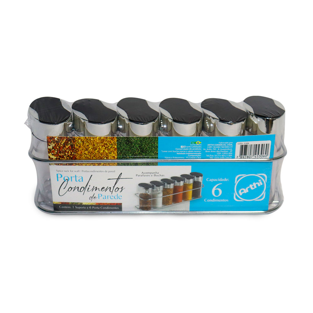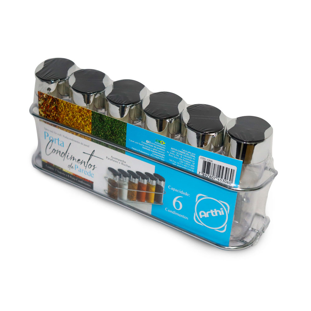 O Jogo de Porta Condimentos de Plástico da Arthi é composto por 6 unidades de plástico e tampa em ABS com detalhes em nylon. Seu material resistente à corrosão, deixa sua cozinha mais moderna e facilita a limpeza dos utensílios. O porta temperos da Arthi torna mais prático o preparo de alimentos e armazenagem das especiarias. Acompanha 1 suporte cromado e 1 kit com buchas e parafusos para instalação. Seu uso é indicado para quem deseja ter sempre à mão os condimentos necessários e otimizar espaço na sua casa.