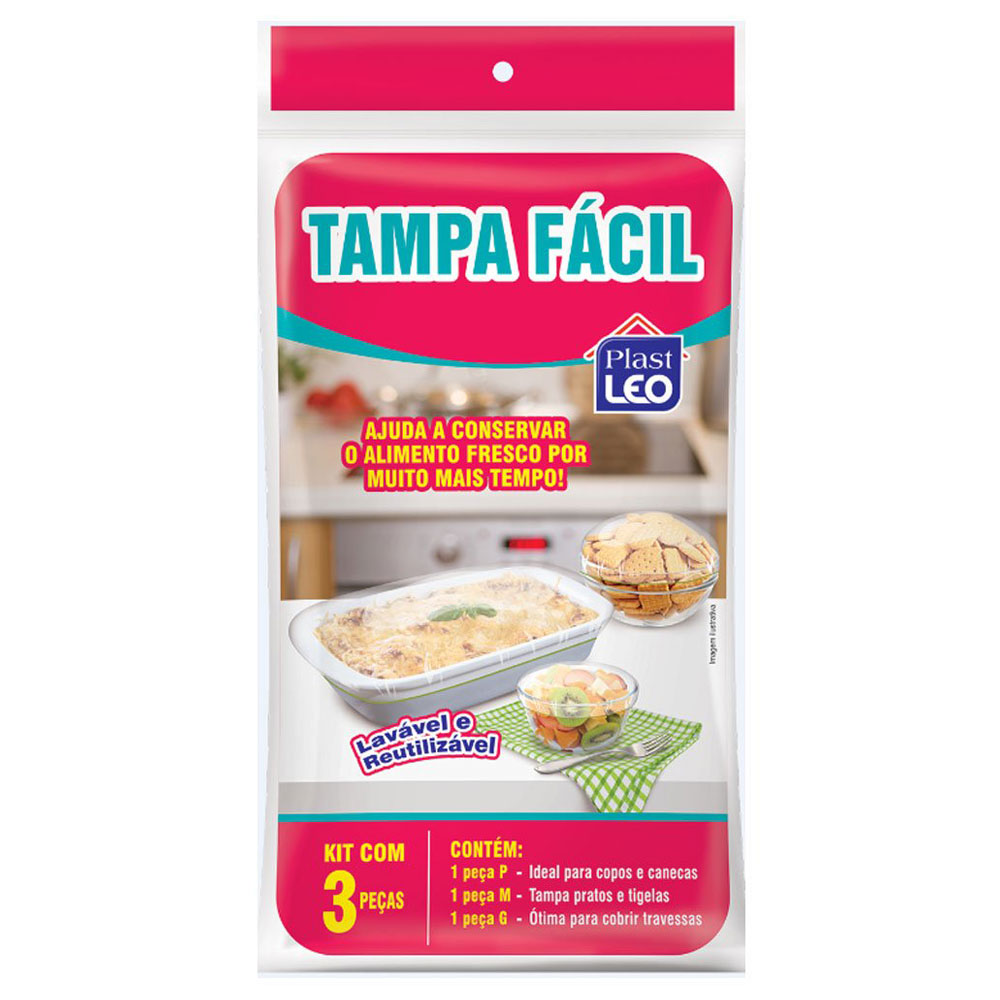 O Kit de Tampas Multiuso da Plast Leo é composto por 3 peças nos tamanhos pequeno, com 15cm, médio com 35cm e grande com 45cm. Perfeito para conservar frios, bebidas, legumes, saladas e outros diversos alimentos, adaptando-se em qualquer formato de prato, vasilha, pote ou panela. Mantem suas receitas protegidas e livres de odor dentro da geladeira. Confeccionado em 100% polietileno, vai facilitar a sua rotina na cozinha.