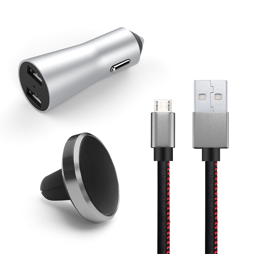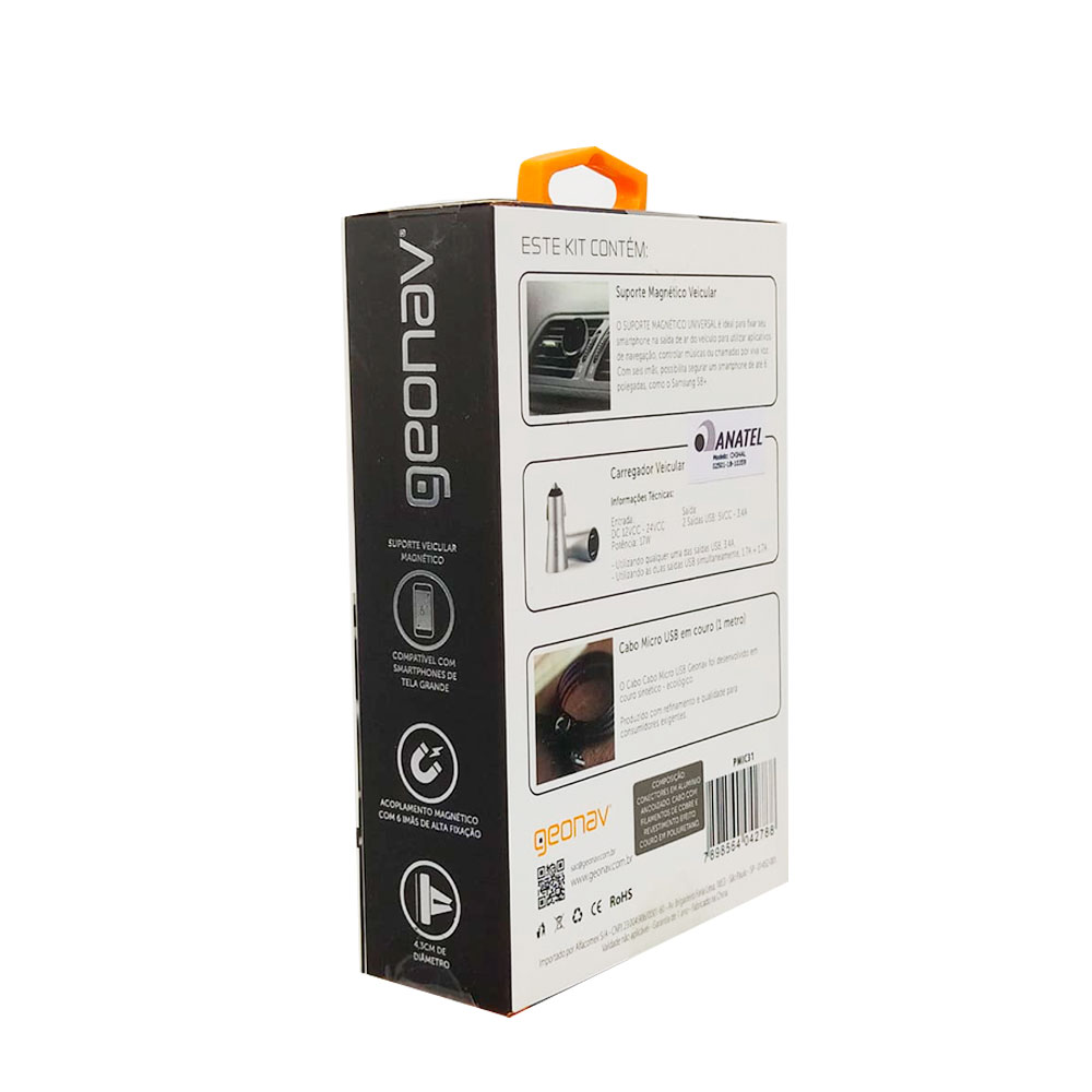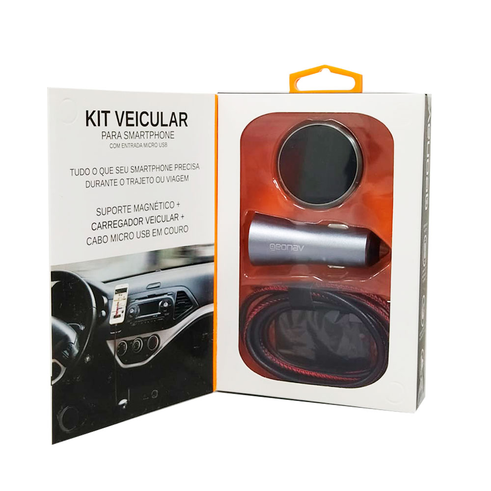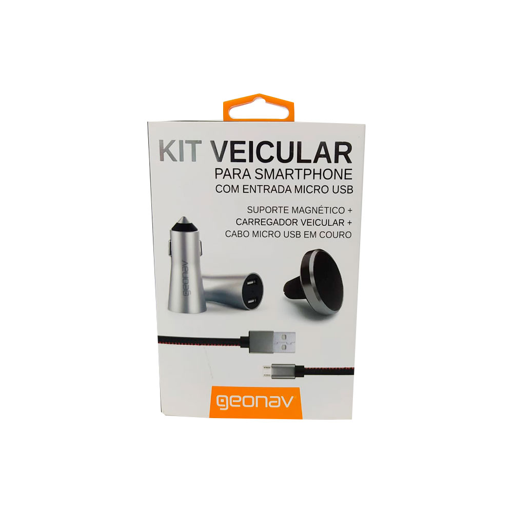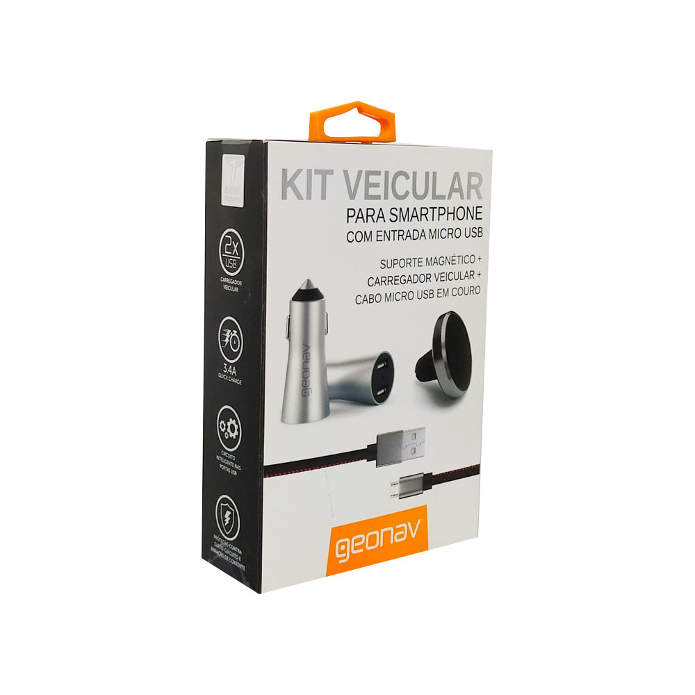 O Kit Veicular para Celular com Suporte, Carregador e USB Geonav é ideal para fixar o aparelho na saída de ar do seu carro, melhorando a utilização de GPS e navegação. O carregador veicular de 3.4A de alumínio, permite carregar dois dispositivos ao mesmo tempo. Produzido em poliuretano, o cabo USB tem 1 metro e é perfeito para carregar seu aparelho, de forma prática e confortável.