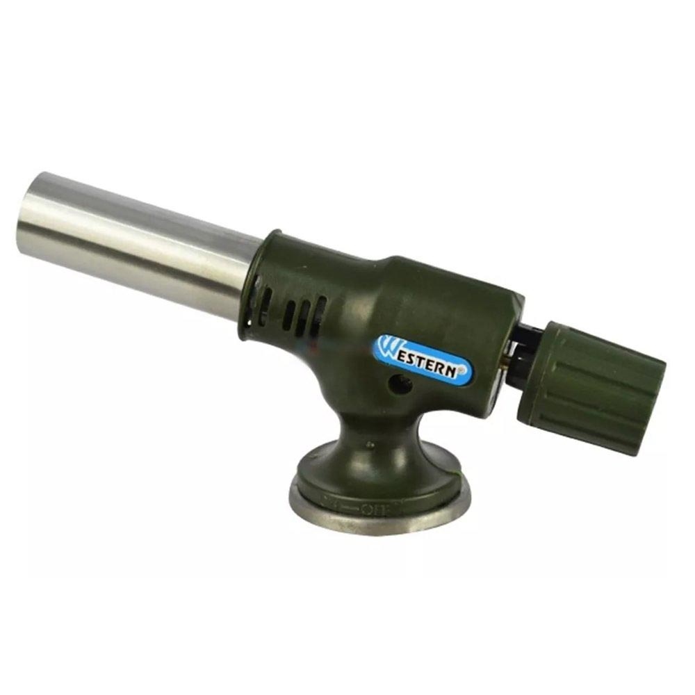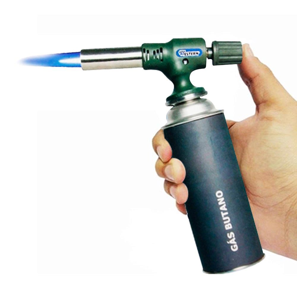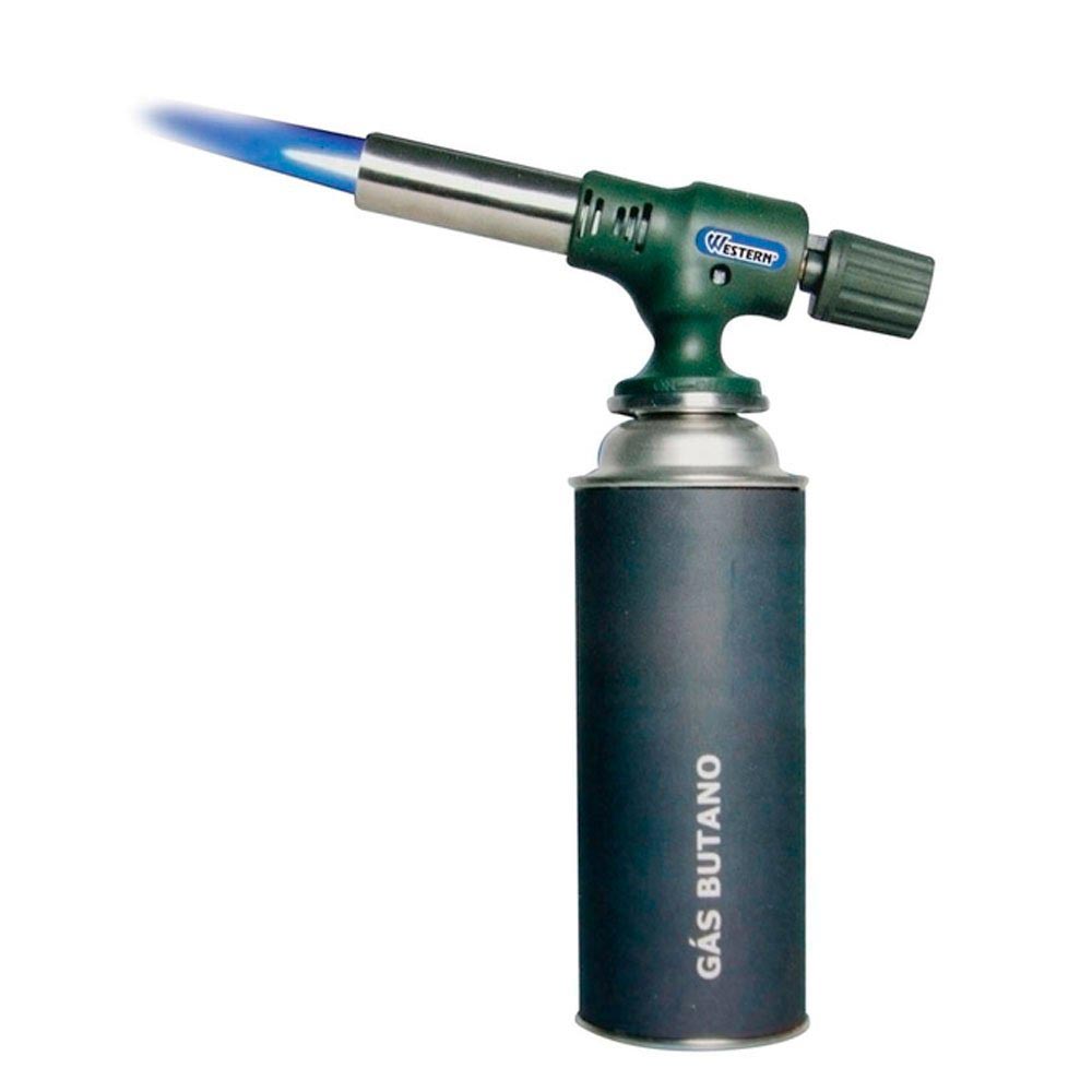 Mini Maçarico para Gás 16 cm Western para consertos em encanamentos, reparos e manutenções, auxílio em artesanatos e laboratório. Feito em cobre, liga de zinco, aço inoxidável e plástico, não acompanha refil de gás butano. Consome certa de 40 gramas de gás butano/por hora.