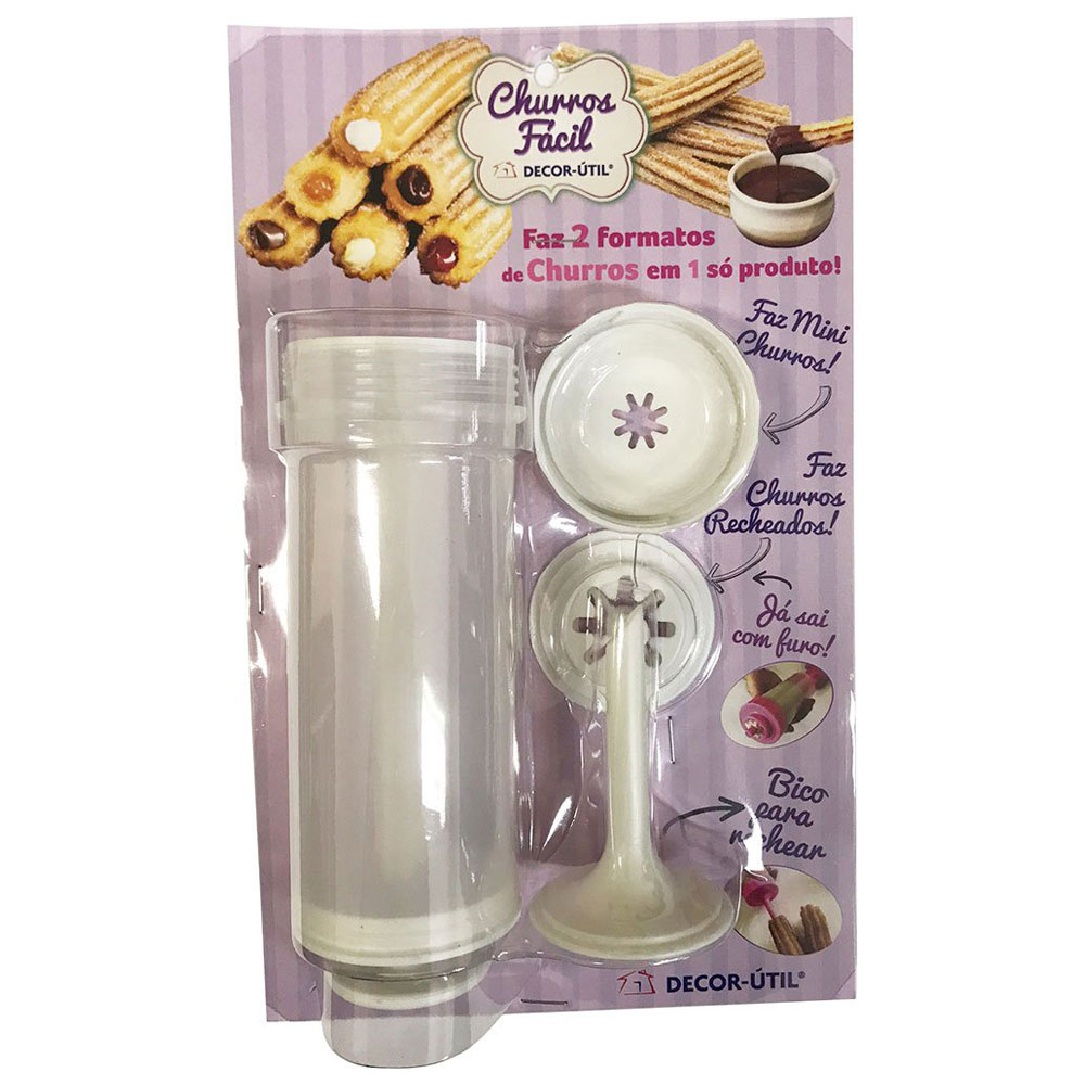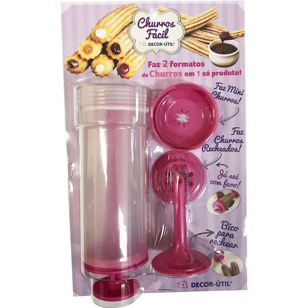 A Máquina de Churros fácil Decor-útil acompanha o modelador de churros recheados, o bico recheador e a nova forminha para moldar mini churros mais finos, sem recheio, para molhar em calda separada. Produzida em plástico com aproximadamente 16,5 cm é prática e fácil de operar. Acompanha receita de churros e modo de usar.
