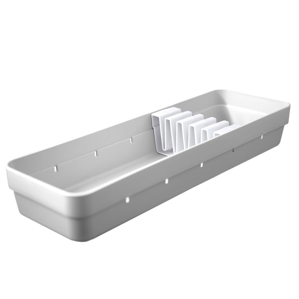 O Organizador de Facas OU possui design inteligente aproveitando ao máximo o espaço das suas gavetas. Em polipropileno, tem capacidade para armazenar com segurança até 5 facas com lâminas de até 8 polegadas. Possui pés antiderrapantes que garantem a fixação do produto na gaveta.
