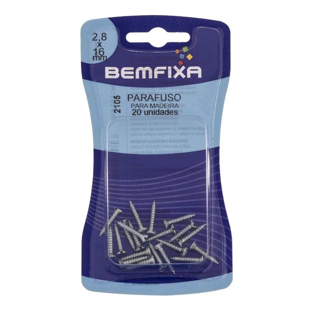 Parafusos Bemfixa produzidos em aço com cabeca chata com encaixe para chave de fenda simples, indicados para trabalhos em madeira e fixação de fechaduras, dobradiças entre outros. Prafuso com dimensões de 2,8 x 16 mm e embalagem com 20 unidades.