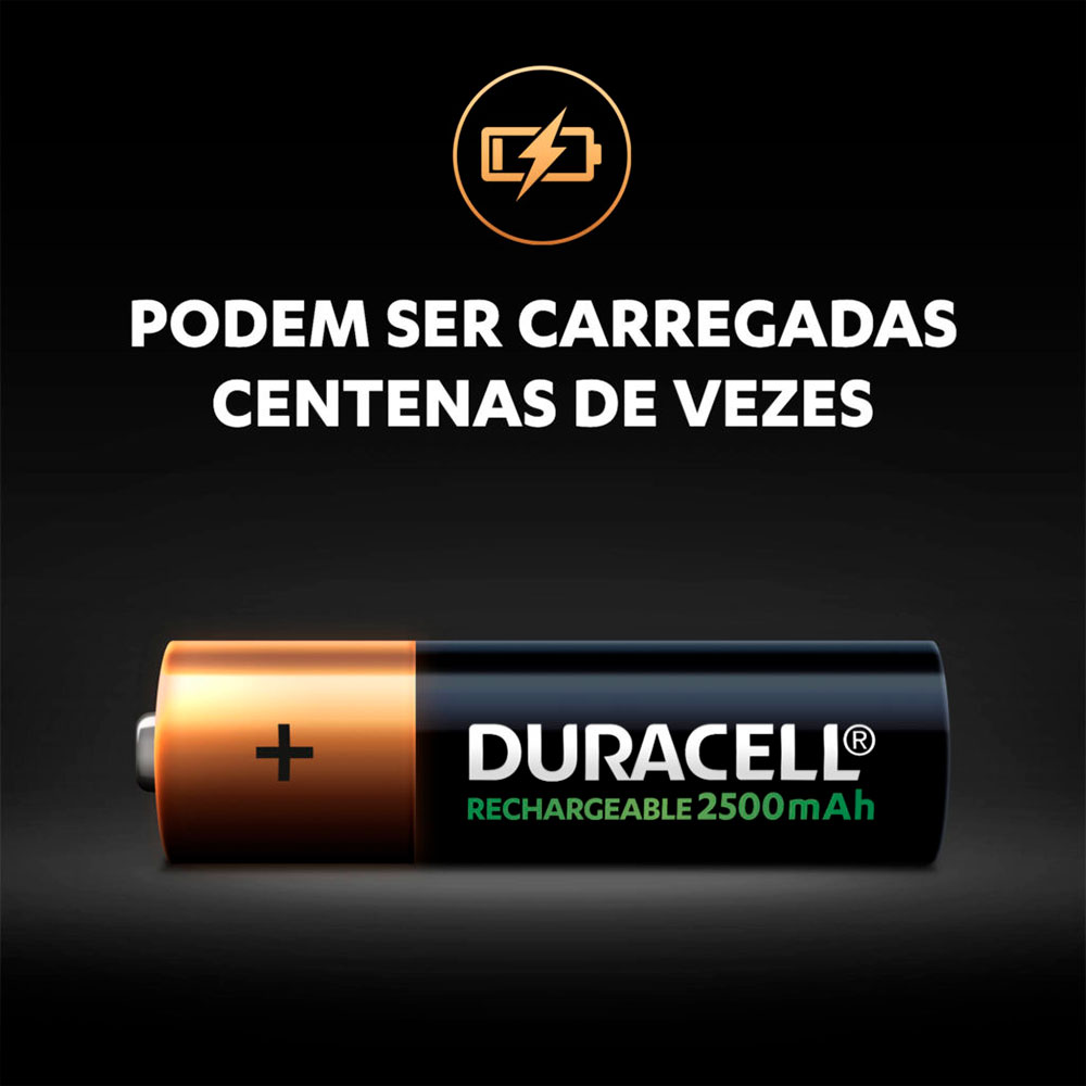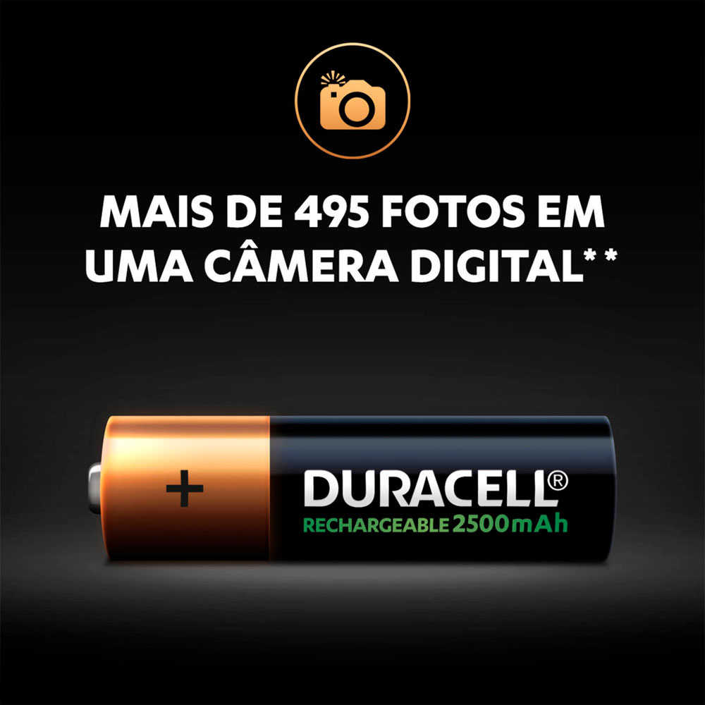 A Pilha Recarregável AA Duracell 2 Unidades de 2500mAh é ideal para controles de vídeo game, brinquedos, câmeras digitais e muitos outros aparelhos. Podem ser recarregadas centenas de vezes em qualquer carregador NiMH. Além de serem pré-carregadas na fabricação, o que possibilita o uso imediato, elas permanecem carregadas por até 12 meses quando não estão em uso e têm duração de até 10 anos.