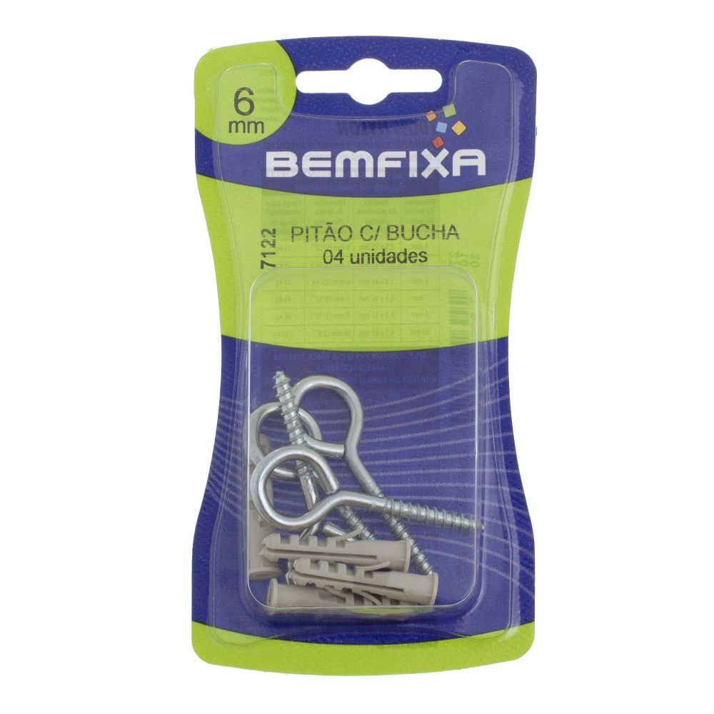 Pitão Zincado com Bucha Bemfixa, fabricados em aço e nylon, são ideais para utilização em trabalhos variados de fixação, objetos suspensos, madeira, etc. Embalagem com 4 buchas de nylon de 6 mm de diâmetro externo e 4 parafusos tipo pitão de qualidade superior, maior durabilidade e resistência.