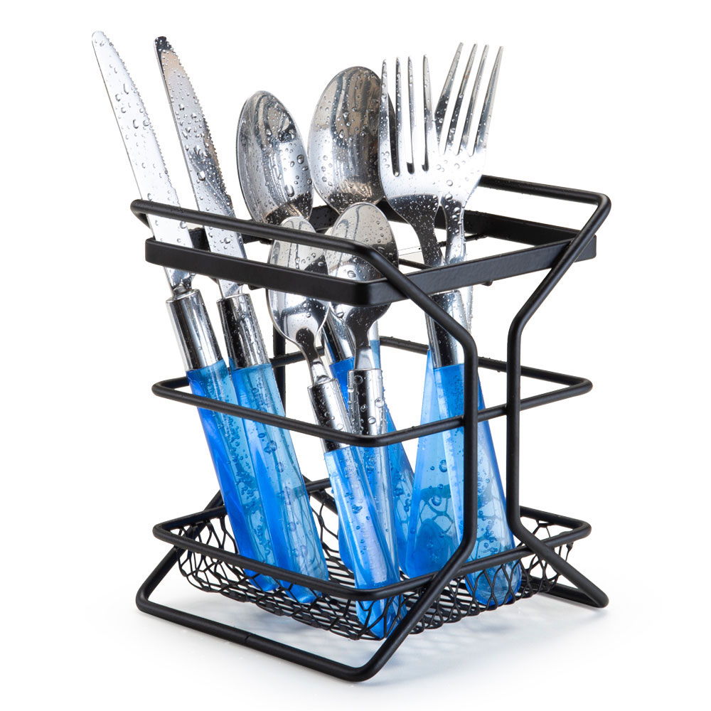 O Porta Talheres Quadrado Arthi é perfeito para servir a mesa ou para usar como escorredor. Com estrutura aramadas em aço preto, possui quatro divisórias para acomodar garfos, facas, colheres e colheres de sobremesa. Mantenha sua pia e mesa organizadas!