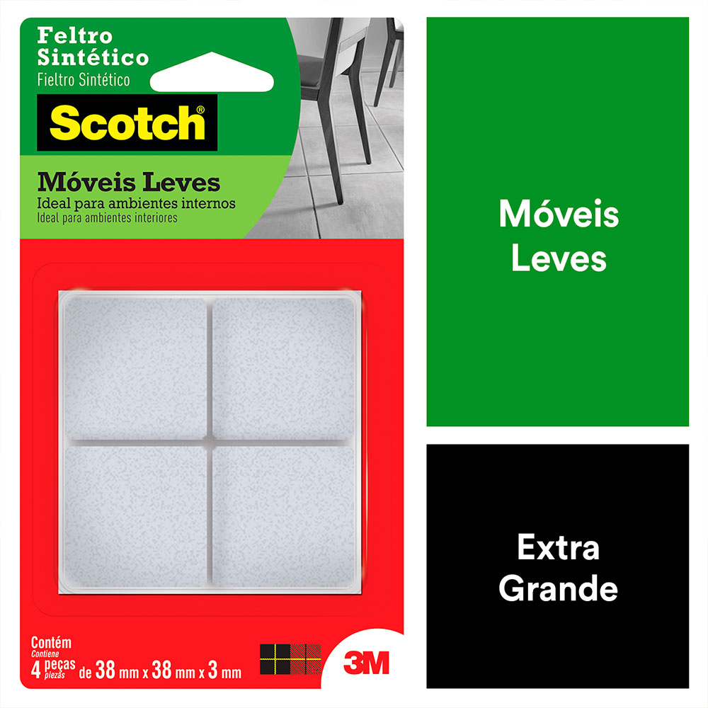 Aplique o protetor anti-risco quadrado em feltro branco Scotch 3M e proteja pisos, paredes e outras superfícies de riscos, marcas e ruídos. De tamanho GG, a embalagem é composta por 4 unidades que medem 38 mm cada, são produzidas sem resina, não riscam, não amarelam e têm qualidade comprovada. Aplique atrás de maçanetas, quadros, móveis, estofados, luminárias e objetos de decoração.