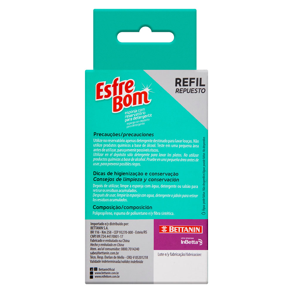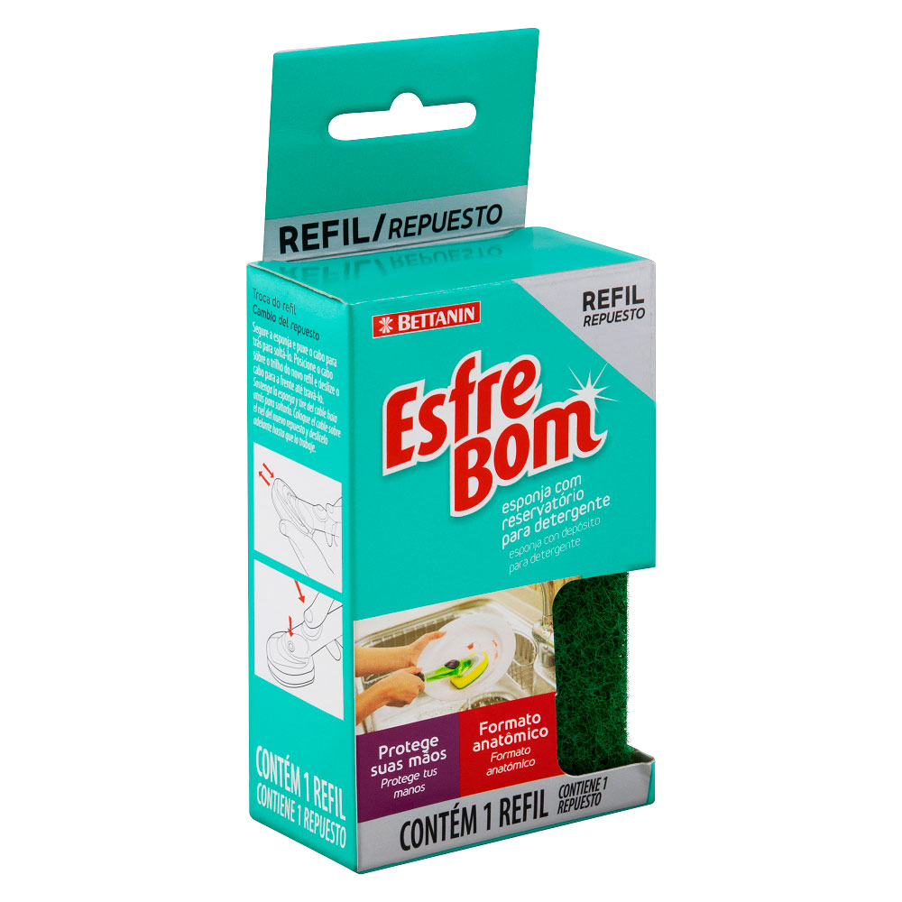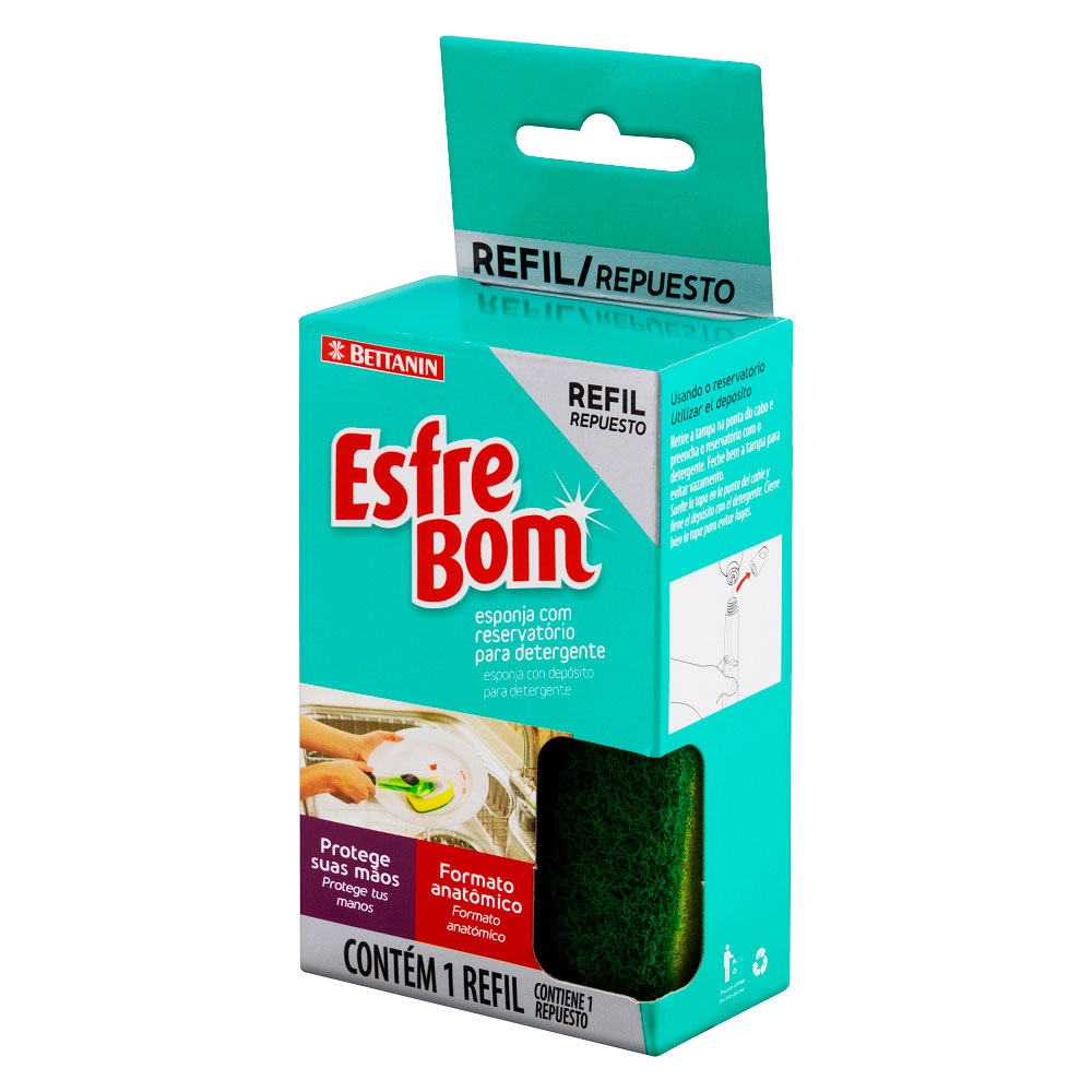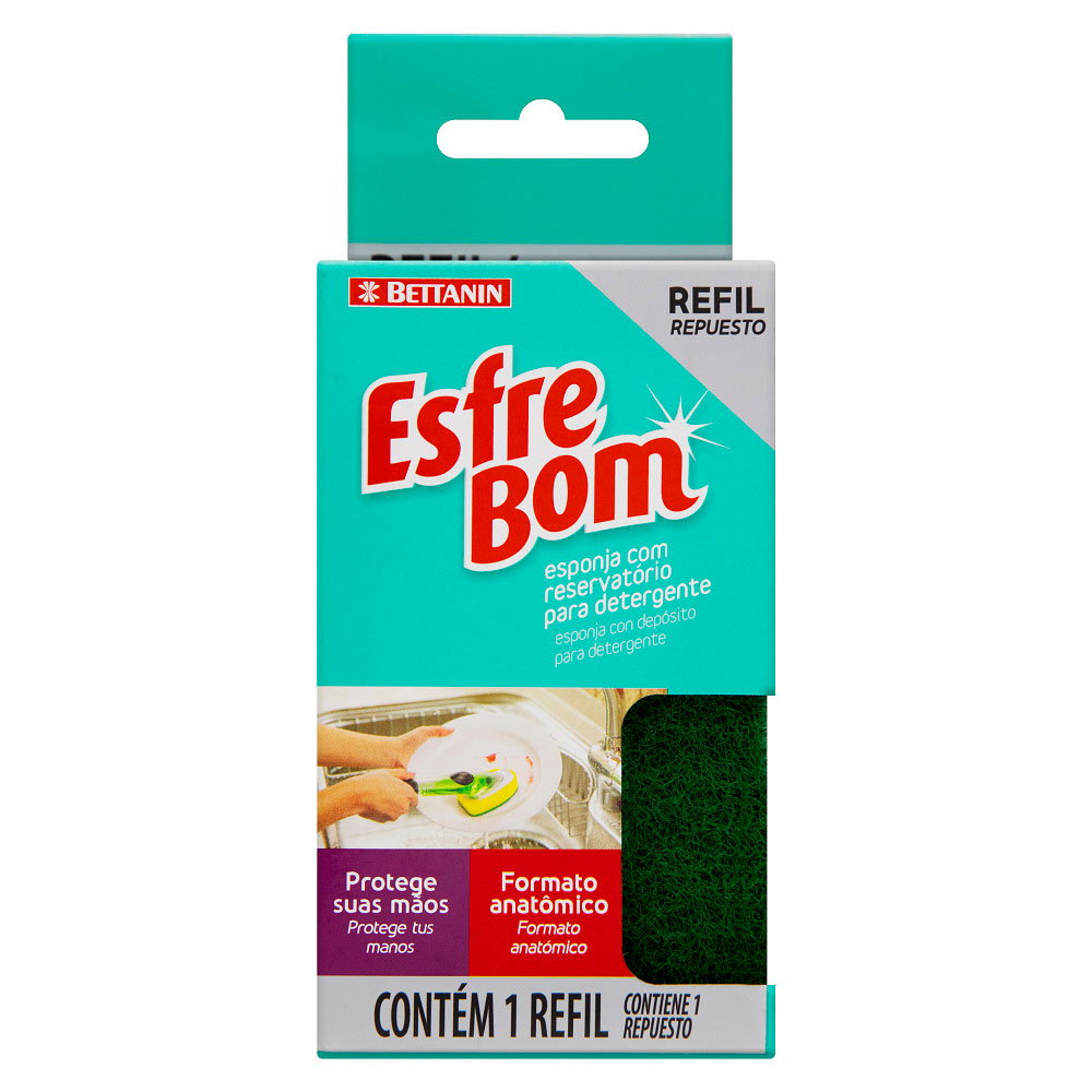 O Refil Esponja Esfrebom Bettanin foi feito para aparelho com reservatório de detergente. É perfeito para proteger as mãos e unhas do contato direto com o detergente, proporcionando mais praticidade na limpeza diária. Produzido em polipropileno e espuma é leve e resistente.