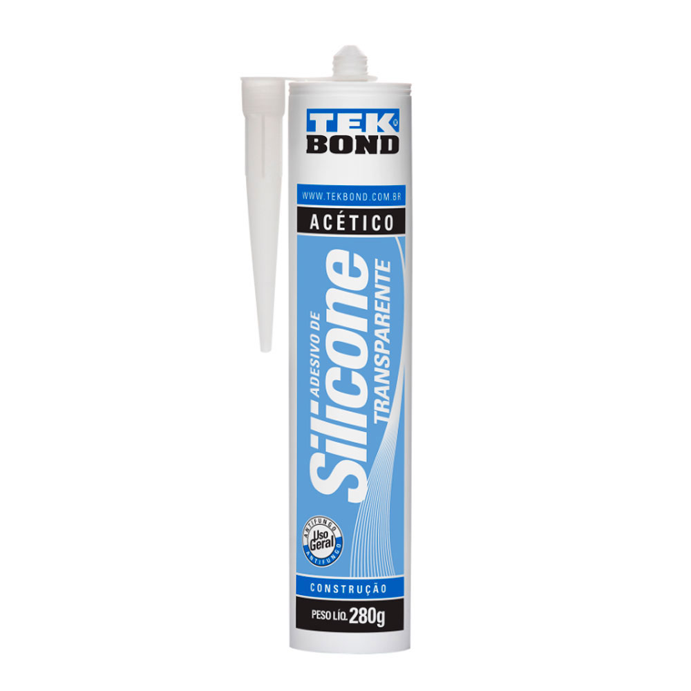 Silicone Acético Transparente Tekbond 280g, produto de uso geral muito utilizado na construção civil na vedação e selagem de pias e vasos sanitários, box em banheiros, portas e janelas. Possui excelente resistência aos raios uv e pode ser aplicado em áreas externas. É um adesivo selante antifungo e de cura acética, sua cura ocorre em temperatura ambiente e na exposição a umidade do ar. É transparente e possui odor característico (ácido acético) e tem secagem com tempo de formação de película de 5 a 15 minutos.