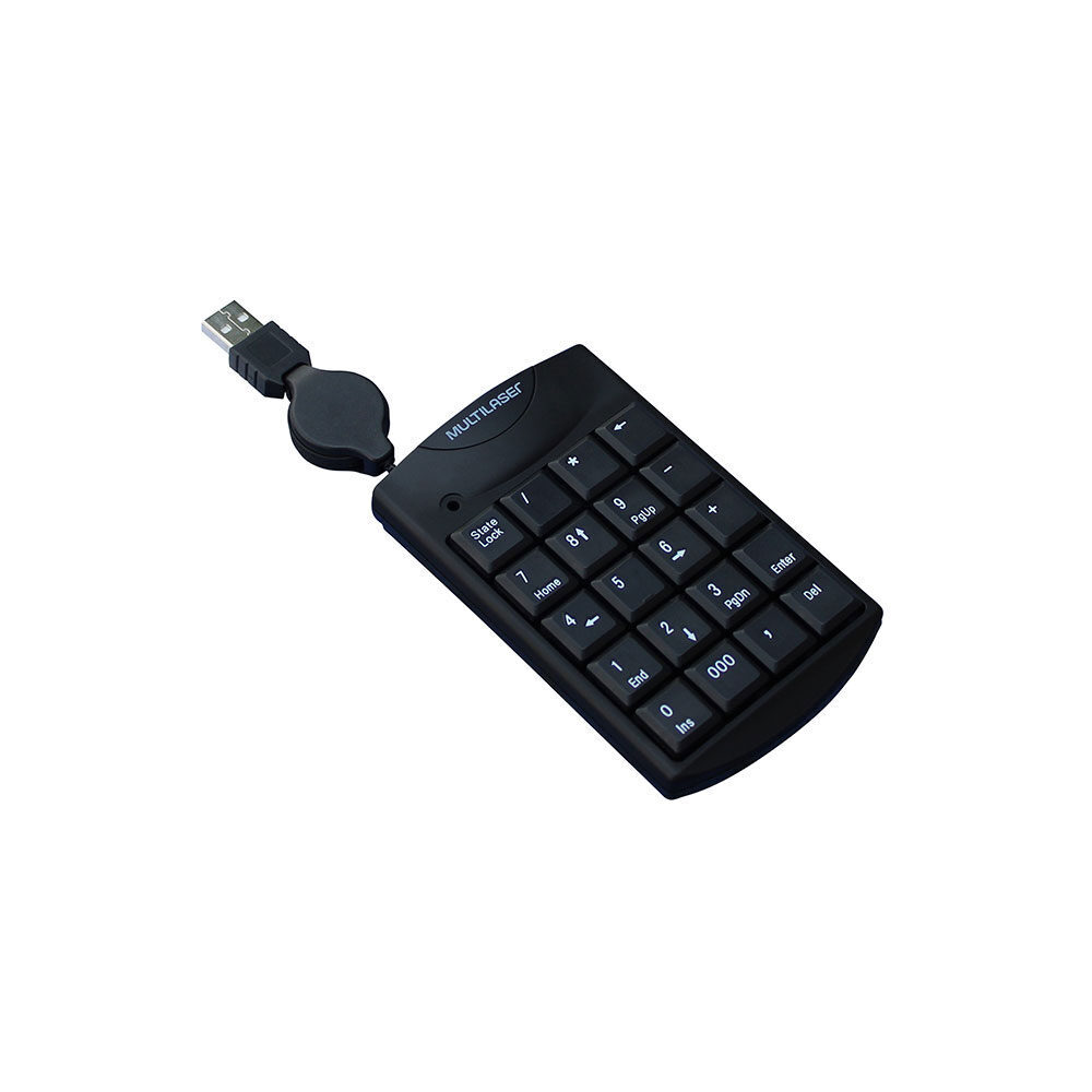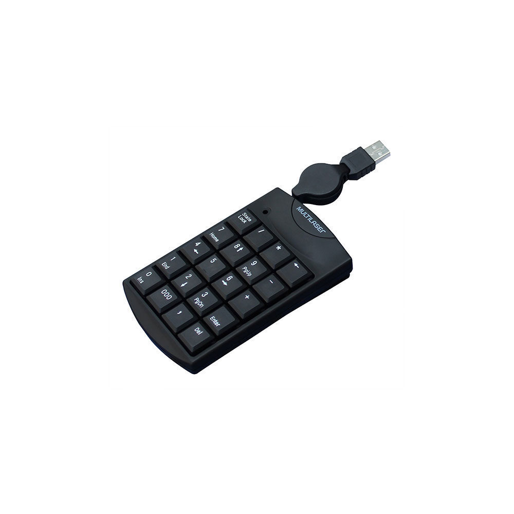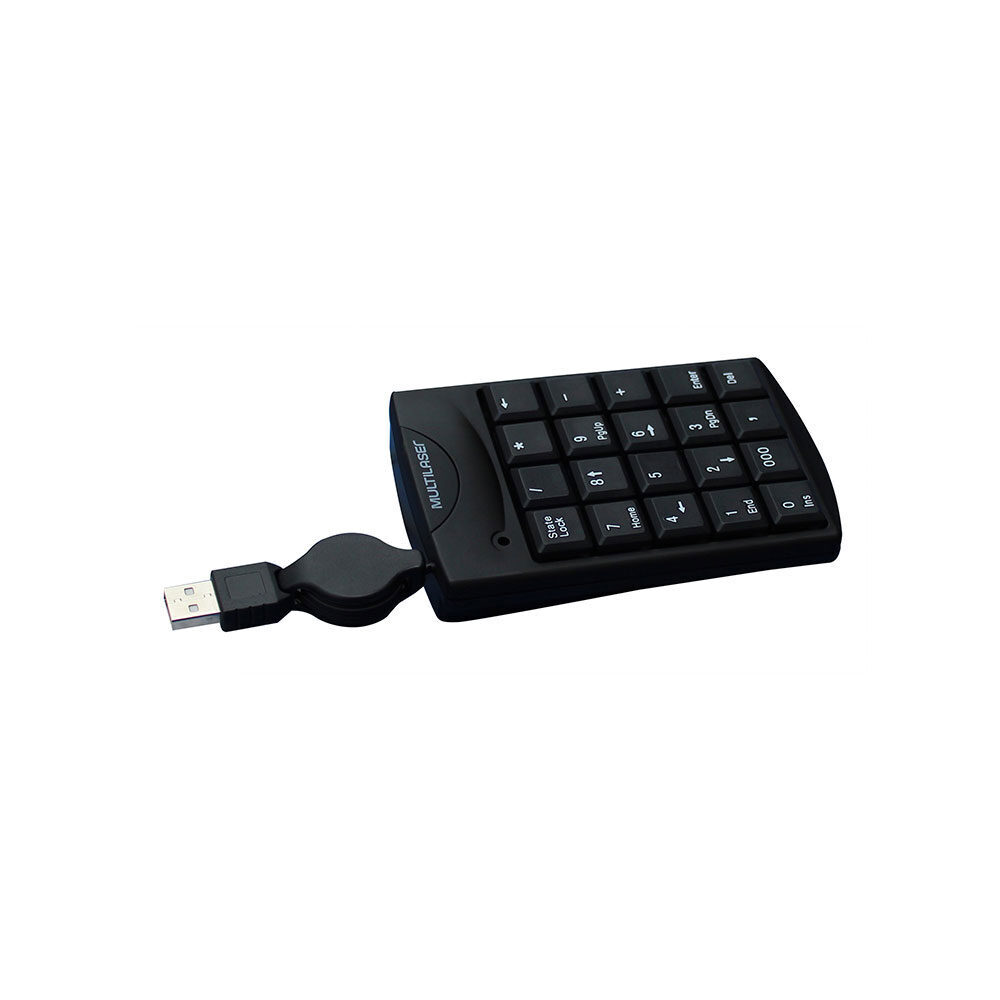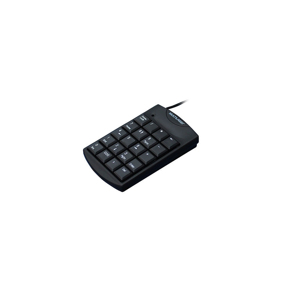 Teclado Numérico TC230 Multilaser com conexão por Fio USB, seu cabo é retrátil e tem 100cm de comprimento. Ideal para notebook, possui teclas macias e silenciosas, e é compatível com windows e mac os. Produzido em plástico na cor preto, possui design clássico e é um item versátil para o uso em casa ou escritório.