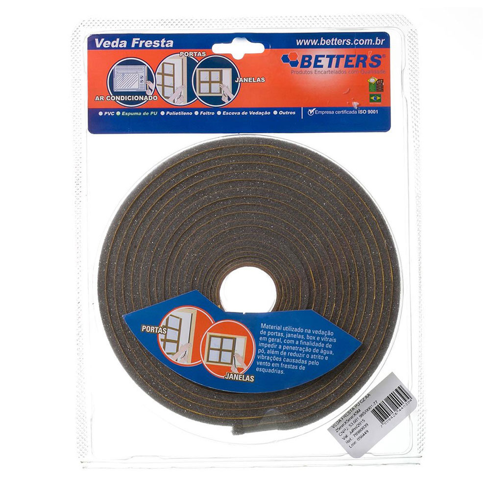 O Veda Frestas Betters é utilizado na vedação de portas, janelas, box e vitrais em geral com a finalidade de impedir a penetração de água, pó e reduzir o atrito e vibrações causadas pelo vento em frestas de esquadrias. Confeccionado em espuma de PU, é auto adesivo com fita de alta qualidade e excelente aderência, não possui resina e não risca. É discreto na cor cinza e possui comprimento de 5 metros.