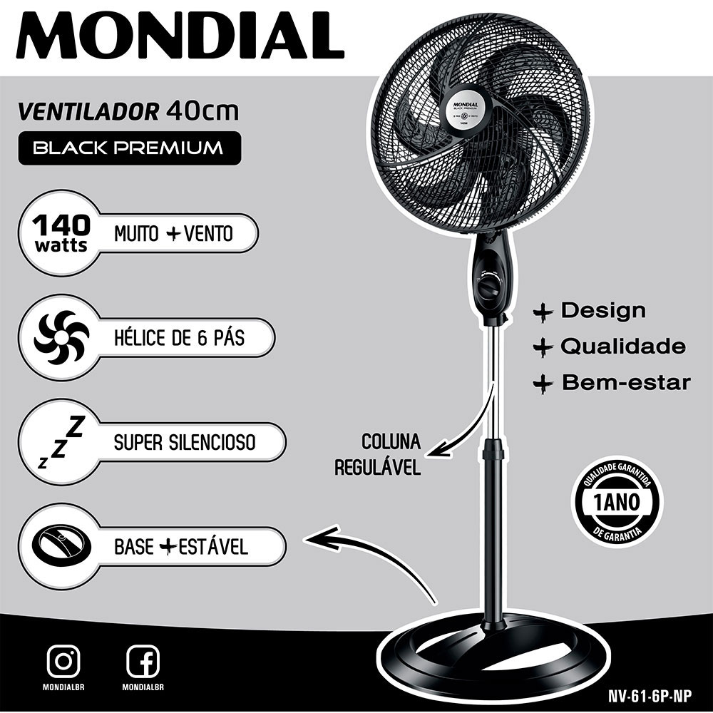 O Ventilador de Coluna Premium Black Mondial traz conforto e bem estar nos dias quentes de verão. Produzido em plástico preto com 3 velocidades e alimentação elétrica de 127v ele oferece mais vento com menos barulho, garantindo uma vazão de ar muito eficiente com um baixo consumo de energia. Sua coluna é regulável, grades desmontaveis e seu botão de fácil acionamento para movimento oscilante se encontra na direção horizontal do produto, também possui ajuste de inclinação.