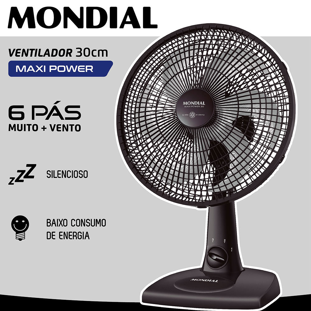 Com o Ventilador de Mesa Maxi Power Mondial você garante mais vento e menos barulho. Produzido em plástico na cor preta com 30cm de diâmetro, possui tensão elétrica de 127v e potência de 50w. Com 3 velocidades e 6 pás na hélice, seu botão de fácil acionamento para movimento oscilante se encontra na direção horizontal do produto, também possui ajuste de inclinação. A opção perfeita para quem busca eficiência na hora de se refrescar.