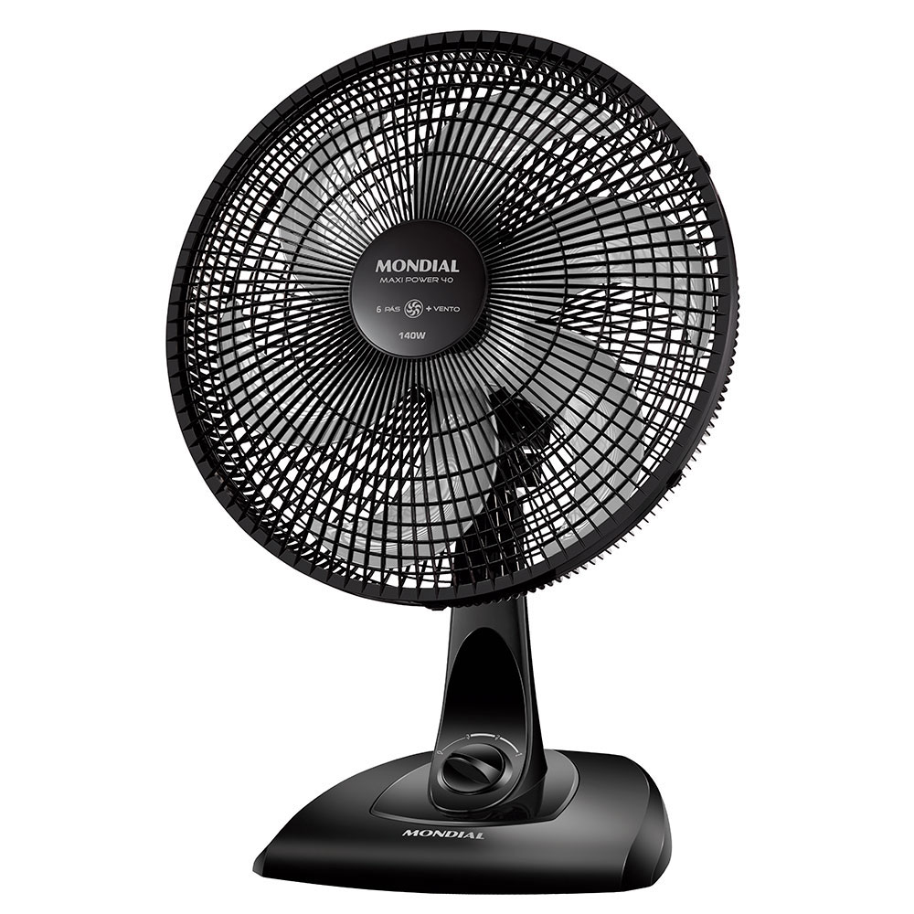 Com o Ventilador de Mesa Maxi Power Mondial você garante mais vento e menos barulho. Produzido em plástico na cor preta com 40cm de diâmetro, possui tensão elétrica de 127v e potência de 140w. Com 3 velocidades e 6 pás na hélice, seu botão de fácil acionamento para movimento oscilante se encontra na direção horizontal do produto, também possui ajuste de inclinação. A opção perfeita para quem busca eficiência na hora de se refrescar.